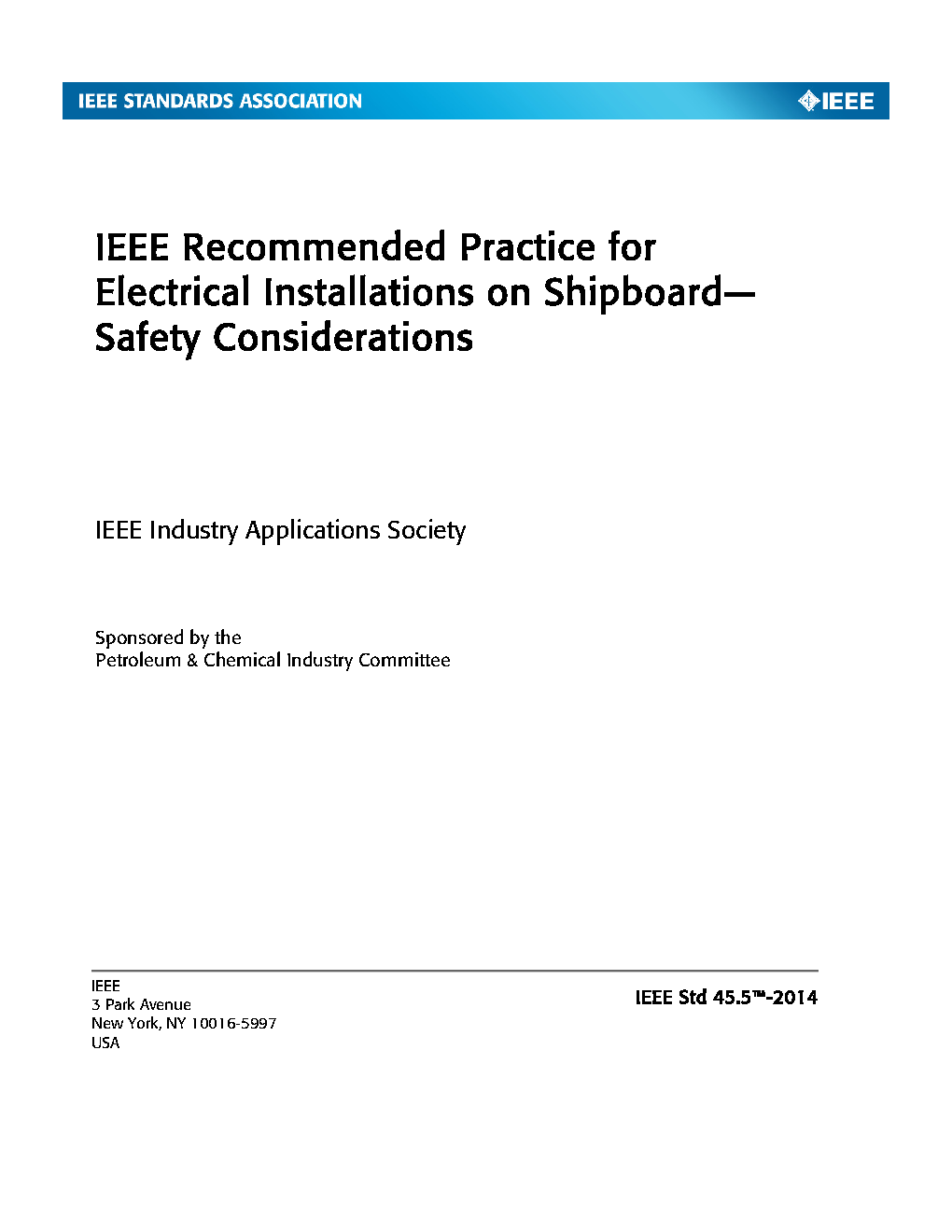 This recommended practice covers electrical safety considerations for shipboard electrical systems and equipment including a review of fundamental concepts pertaining to electrical safety and establishing electrical safety programs and work practices associated with the operation and maintenance of shipboard electrical power distribution systems.