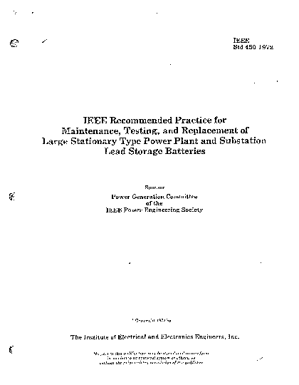 This document provides recommended maintenance, test schedules, and testing procedures that can be used to optimize the life and performance of permanently-installed, vented lead-acid storage batteries used in standby service. It also provides guidance to determine when batteries should be replaced. This recommended practice is applicable to standby service stationary applications where a battery charger normally maintains the battery fully charged and provides the dc loads.