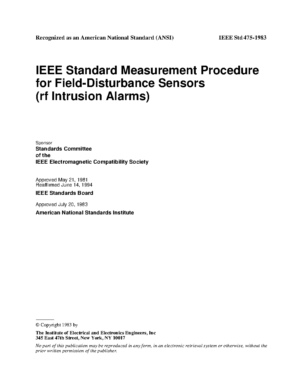 IEEE Standard Measurement Procedure for Field-Disturbance Sensors (rf Intrusion Alarms)