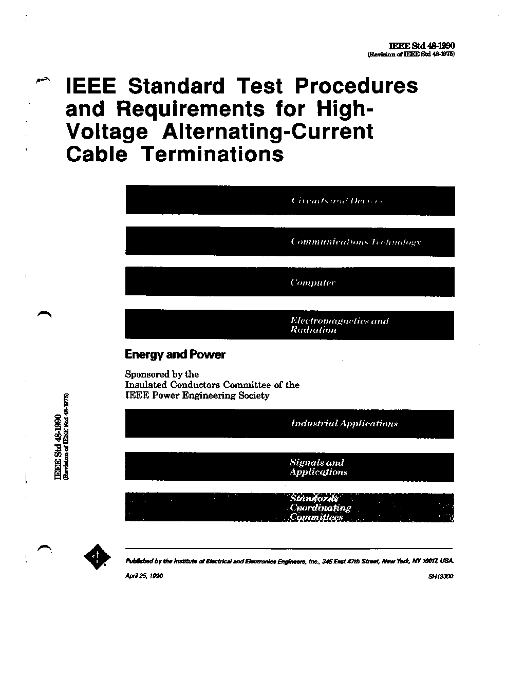 This standard covers all indoor and outdoor cable terminations used on alternating-current shielded cables having laminated insulation from 2.5 kV through 765 kV and extruded insulation rated 2.5 kV through 500 kV, except separable insulated connectors, which are covered by IEEE Std 386. Cable terminations and component parts shall be capable of withstanding the tests specified in this standard.