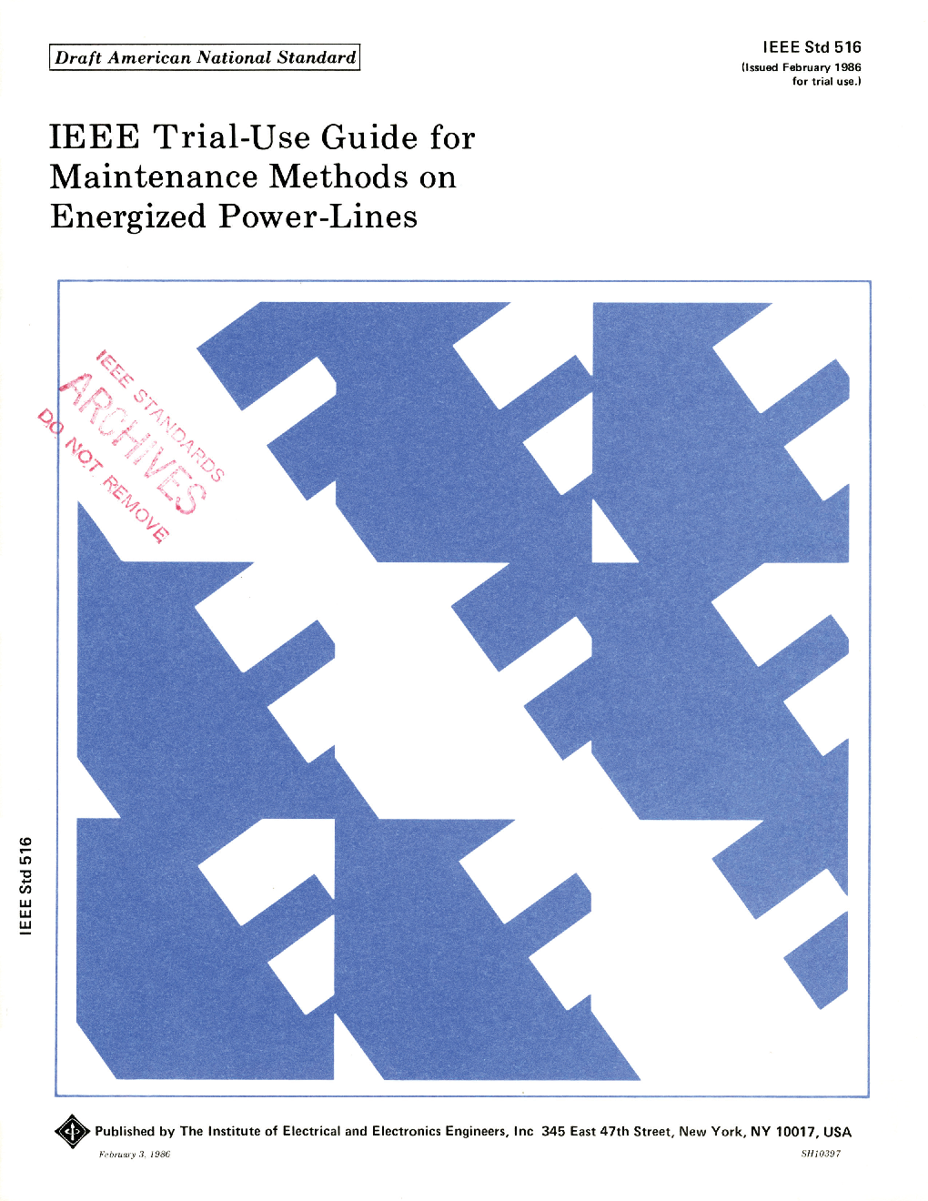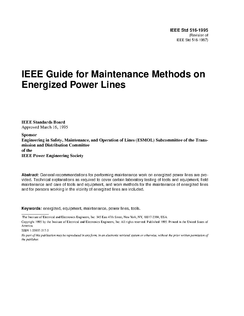 This guide provides the general recommendations for performing maintenance work on energized power lines. It is not intended to include all of the proven practical methods and procedures; however, these selected comprehensive recommendations are based on sound engineering principles, engineering safety considerations, and field experience by many utilities. Included are technical explanations as required to cover certain laboratory testing of tools and equipment, in-service inspection, maintenance and care of tools and equipment, and work methods for the maintenance of energized lines and for persons working in vicinity of energized lines.