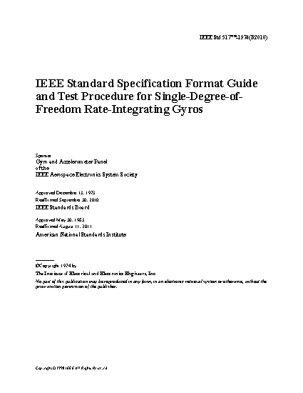 A specification format guide for the preparation of a rate-integrating gyro specification that provides a common meeting ground of terminology and practice for manufacturers and users is presented. A compilation of recommended procedures for testing a rate-integrating gyro is given. An errata is available at http://standards.ieee.org/reading/ieee/updates/errata/517-1974_errata.pdf