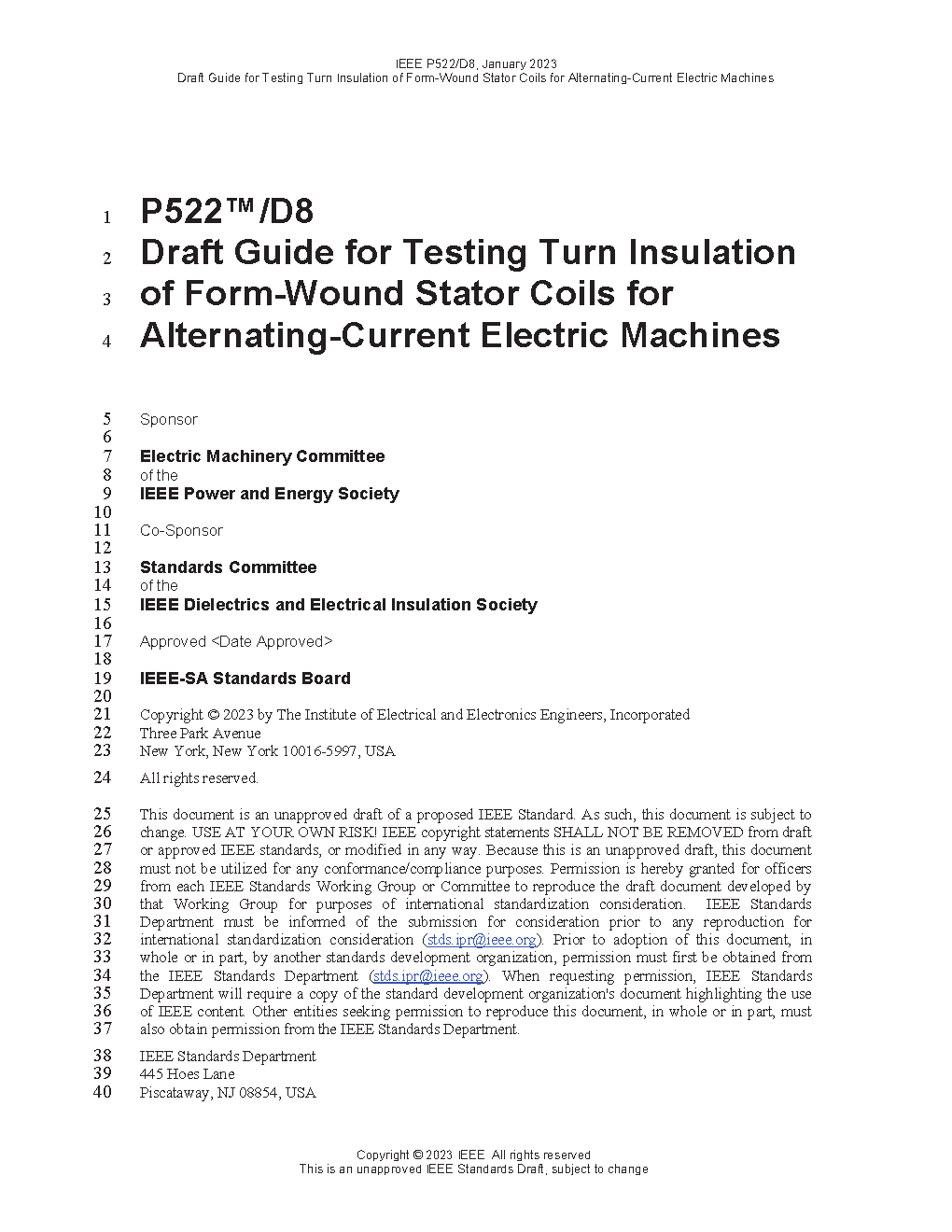The purpose of this guide is to make suggestions on testing the dielectric strength of the insulation separating the various turns from each other within multiturn form-wound coils to determine the acceptability of the coils. Typical ratings of machines employing such coils normally lie within the range of 200 kW to 100 MW. Test voltage levels described herein do not evaluate the ability of the turn insulation to withstand abnormal voltage surges, as contrasted to surges associated with normal operation. These suggestions apply to: