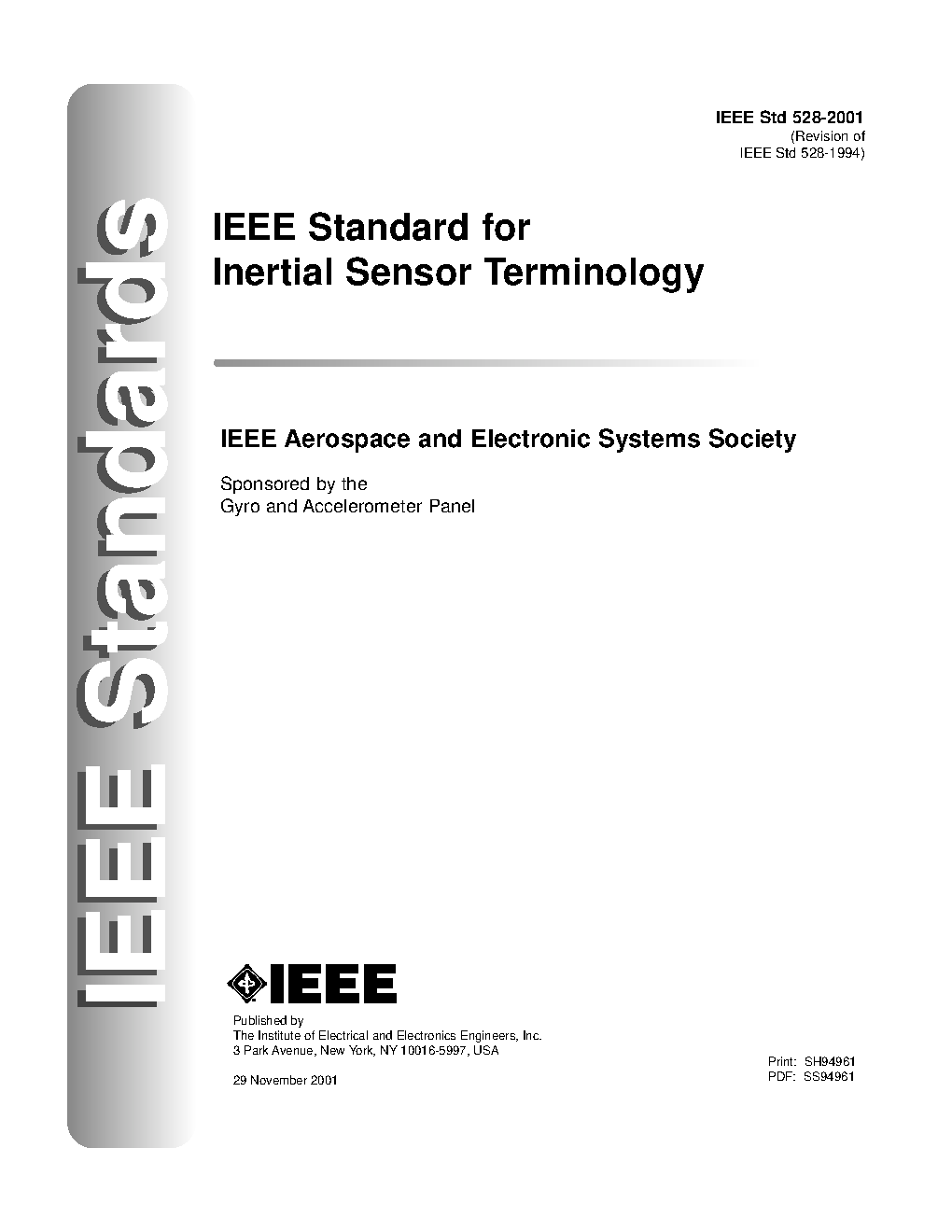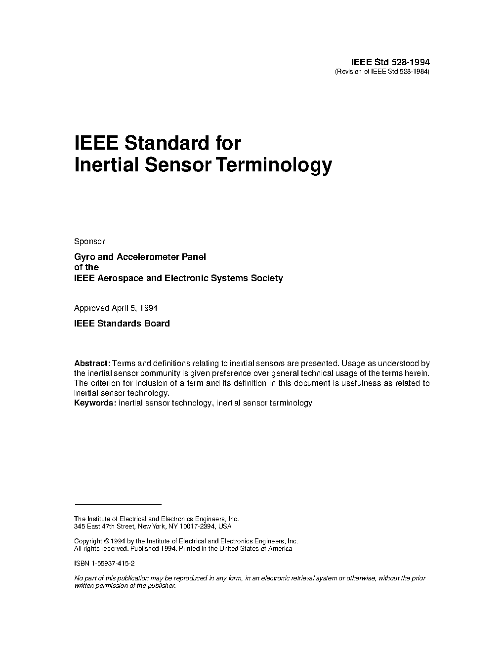 Terms and definitions relating to inertial sensors are presented in this standard. Usage as understood by the inertial sensor community is given preference over general technical usage of the terms herein. The criterion for inclusion of a term and its definition in this standard is usefulness as related to inertial sensor technology.