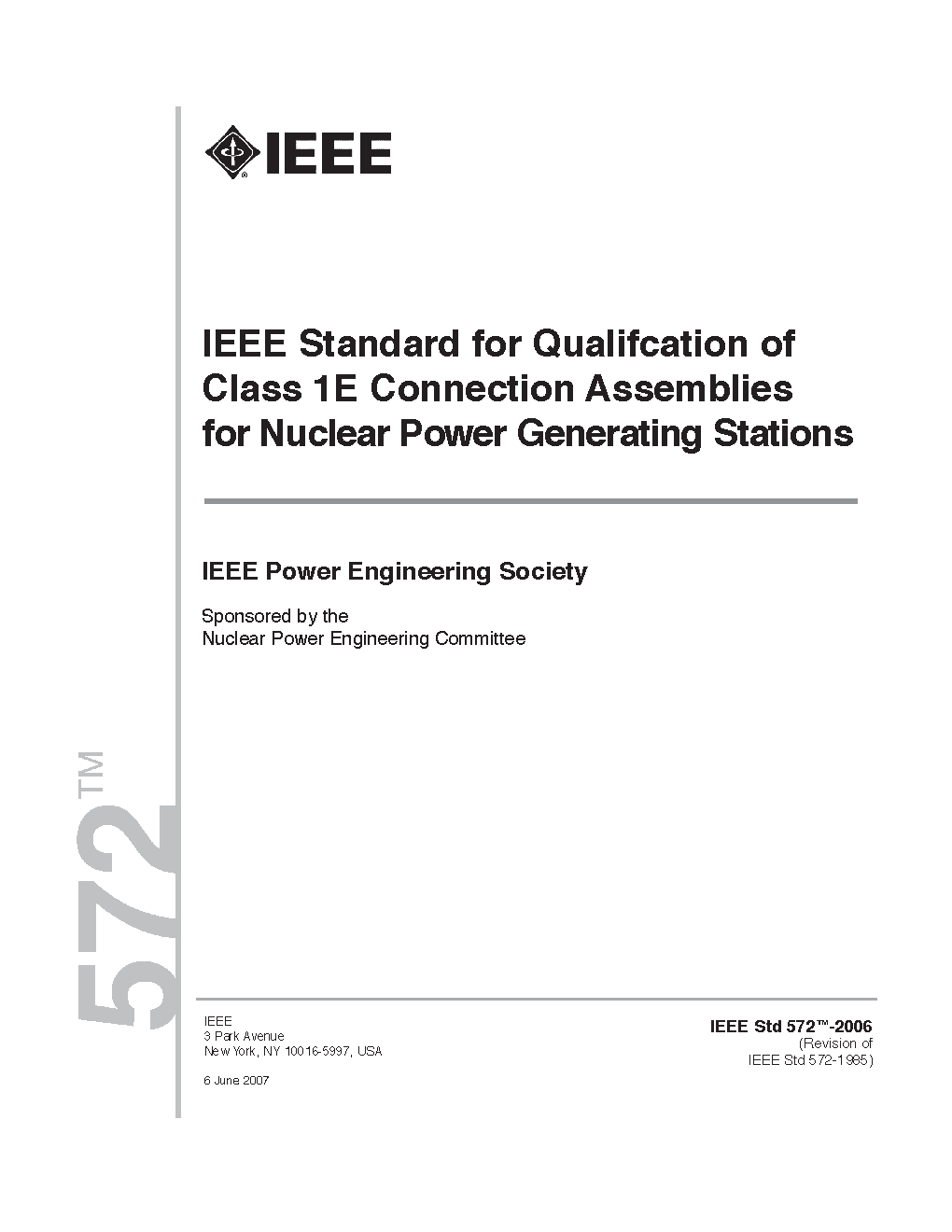 General requirements, direction, and methods for qualifying Class 1E connection assemblies for service in nuclear power generating stations are provided. Connectors, terminations, and environmental seals in combination with related cables or wires as assemblies are covered. Emphasis is placed on multipin, quick, disconnect-type connection assemblies primarily utilized for instrumentation, control, and power. This standard does not apply to containment electric penetrations, fire stops, in-line splices, or components for service within the reactor vessel.