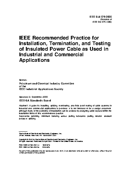 This recommended practice provides a guide for installation, splicing, terminating and field proof testing of cable systems as used in industrial and commercial applications. It is not intended to be a design document. Although many of the problems of installation can be avoided by designing cable layouts with the installation limits of this recommended practice.