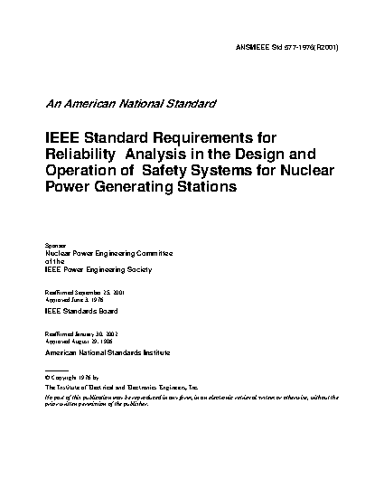 The minimum acceptable requirements for the performance of reliability analyses for safety systems when used to address the reliability considerations discussed in industry standards and guidelines are set forth in this standard. The requirement that a reliability analysis be performed does not originate with this standard. However, when reliability analysis is used to demonstrate compliance with reliability requirements, this standard describes an acceptable response to the requirements.