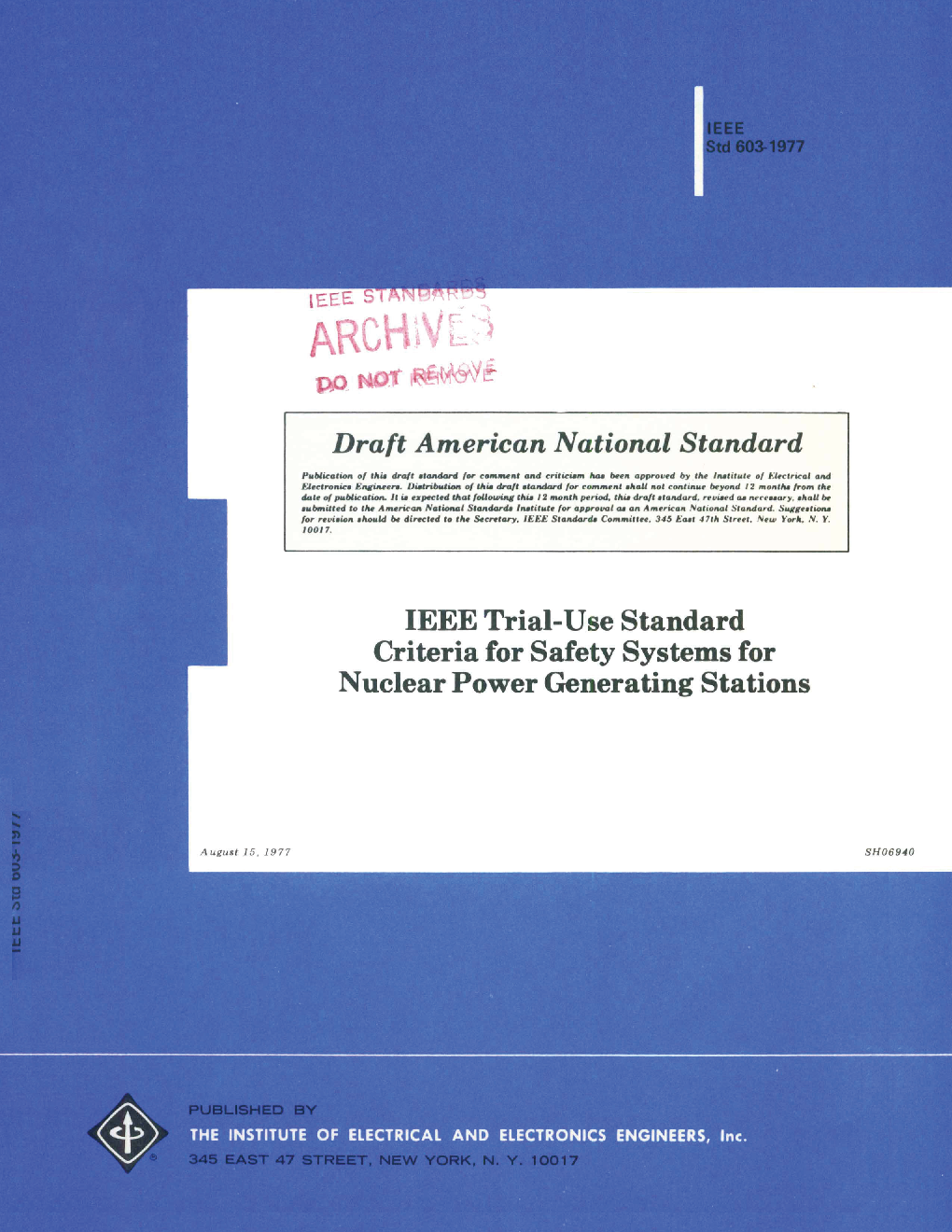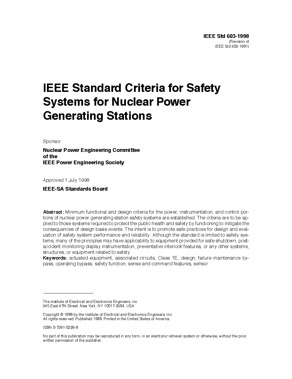 Establishes minimum functional design criteria for the power, instrumentation, and control portions of nuclear power generating station safety systems. The criteria are to be applied to those systems required to protect the public health and safety by functioning to mitigate the consequences of design basis events. The intent is to promote safe practices for design and evaluation of safety system performance and reliability. Although the standard is limited to safety systems, many of the principles may have applicability to equipment provided for safe shutdown, post-accident monitoring display instrumentation, preventive interlock features, or any other systems, structures, or equipment related to safety.
