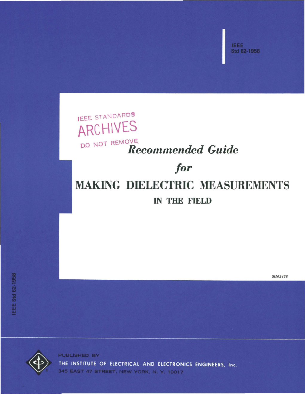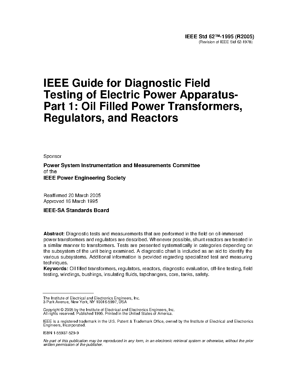 This guide describes diagnostic tests and measurements that are performed in the Þeld on oil-immersed power transformers and regulators. Whenever possible, shunt reactors are treated in a similar manner to transformers. The tests are presented systematically in categories depending on the subsystem of the unit being examined. A diagnostic chart is included as an aid to identifying the various subsystems. Additional information is provided regarding specialized test and measuring techniques. Interpretive discussions are also included in several areas to provide additional insight on the particular test, or to provide guidance on acceptance criteria. These discussions are based on the authorsÕ judgement of accepted practice. It should be noted that sometimes the results of several types of tests should be interpreted together to diagnose a problem. ManufacturerÕs acceptance criteria should also be consulted as it may take precedence over the criteria in this guide.