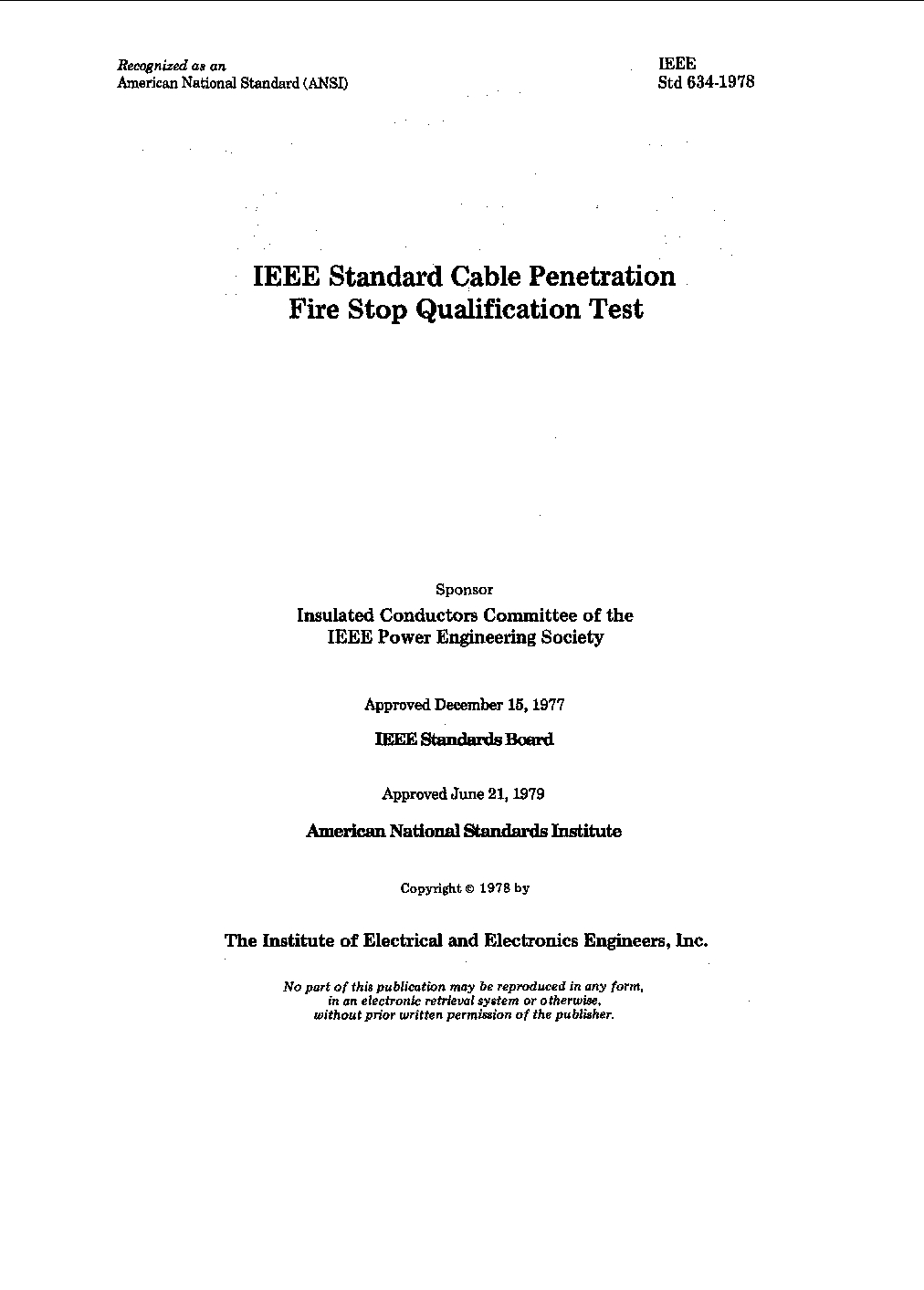 Revision of IEEE Std 634-1978 This standard is applicable to fire stops of various materials and construction. Cablepenetration fire stops are intended for use in fire-resistive barriers. Tests conducted in conformance with this standard will record the performance of fire stops during the test exposure. The resistance of a fire stop to an external force imposed by a hose stream or water spray will also be considered in this standard. The intent of this standard is to develop data to assist in determining the suitability of a fire stop for use where fire resistance is required.