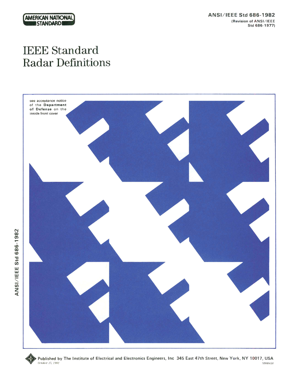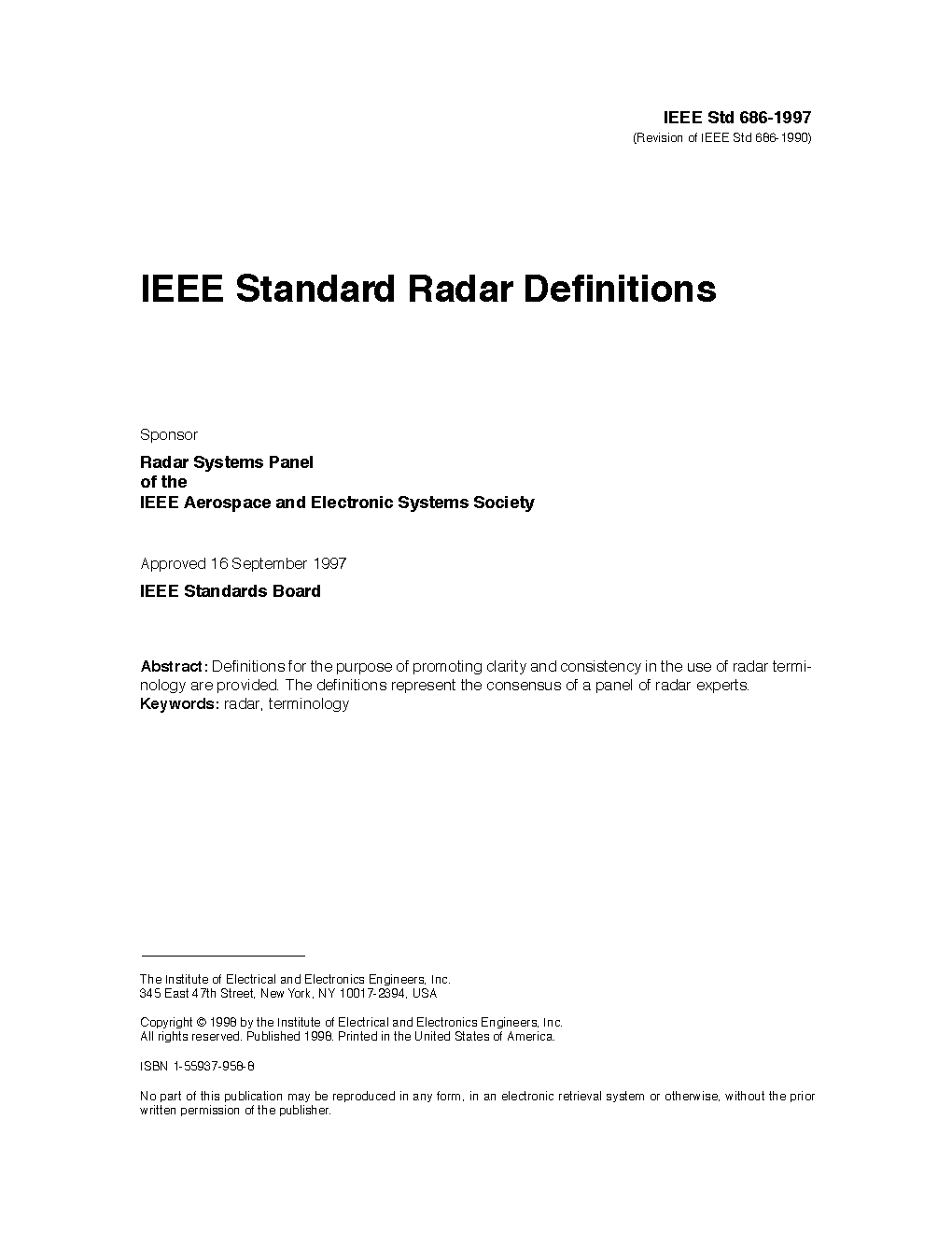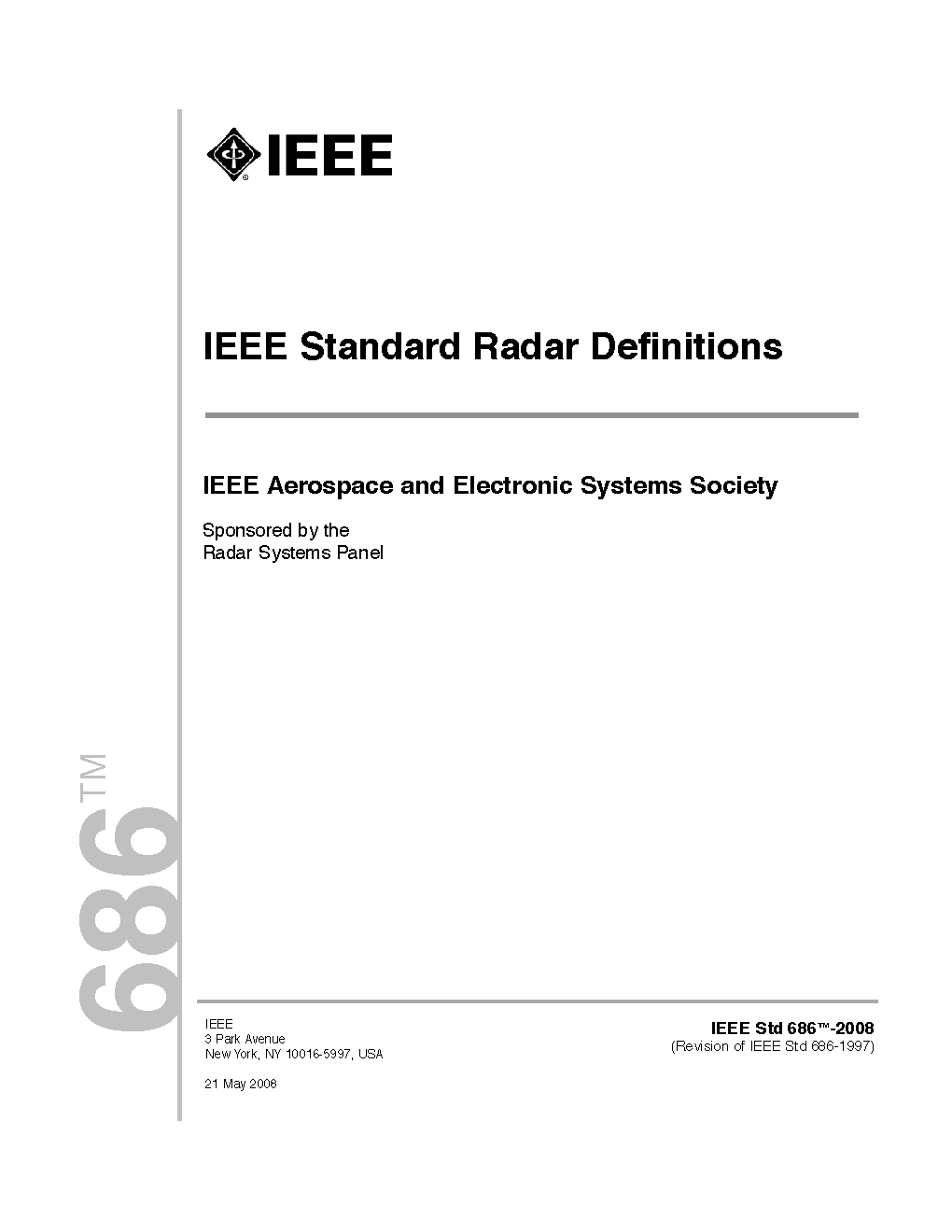This standard is published for the purpose of promoting clarity and consistency in the use of radar terminology. The definitions represent the consensus of a panel of radar experts. The purpose of the revision is to add new terms, revise others, and delete a number of obsolete terms that no longer appear in radar literature or usage.
