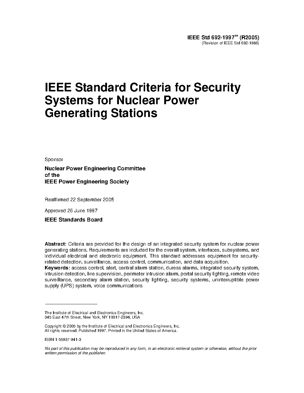 IEEE Standard for Criteria for Security Systems for Nuclear Power Generating Stations