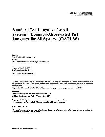IEEE Std 716-1995 defines a high order language for testing. This language is designed to describe tests in terms that are independent of any specific test system. It has been constrained to ensure that it can be implemented on automatic test equipment. This document defines an operational standard that was originally based upon the language defined by the reference document for the ATLAS language, IEEE Std 416-1984, in that, for those cases where a capability was required that went beyond the existing reference document and working papers, or it was not possible to conveniently subset the 416 material, extensions were developed for IEEE Standard 716.