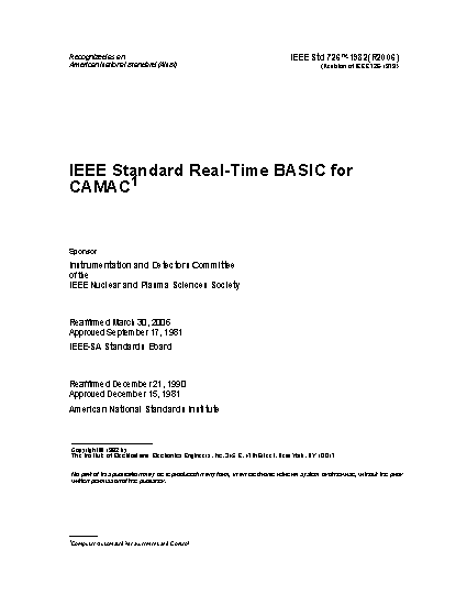 This standard defines ANSI Standard Real-Time BASIC, in which the declarations and real-time statements are defined for use with CAMAC hardware. It covers real-time capabilities, declarations, parallel activities, CAMAC input and output, the CAMAC Q and X signals, CAMAC LAM handling, message passing, shared data, and bit manipulation. The aim is to achieve maximum compatibility between different implementations of ANSI BASIC for use with CAMAC.
