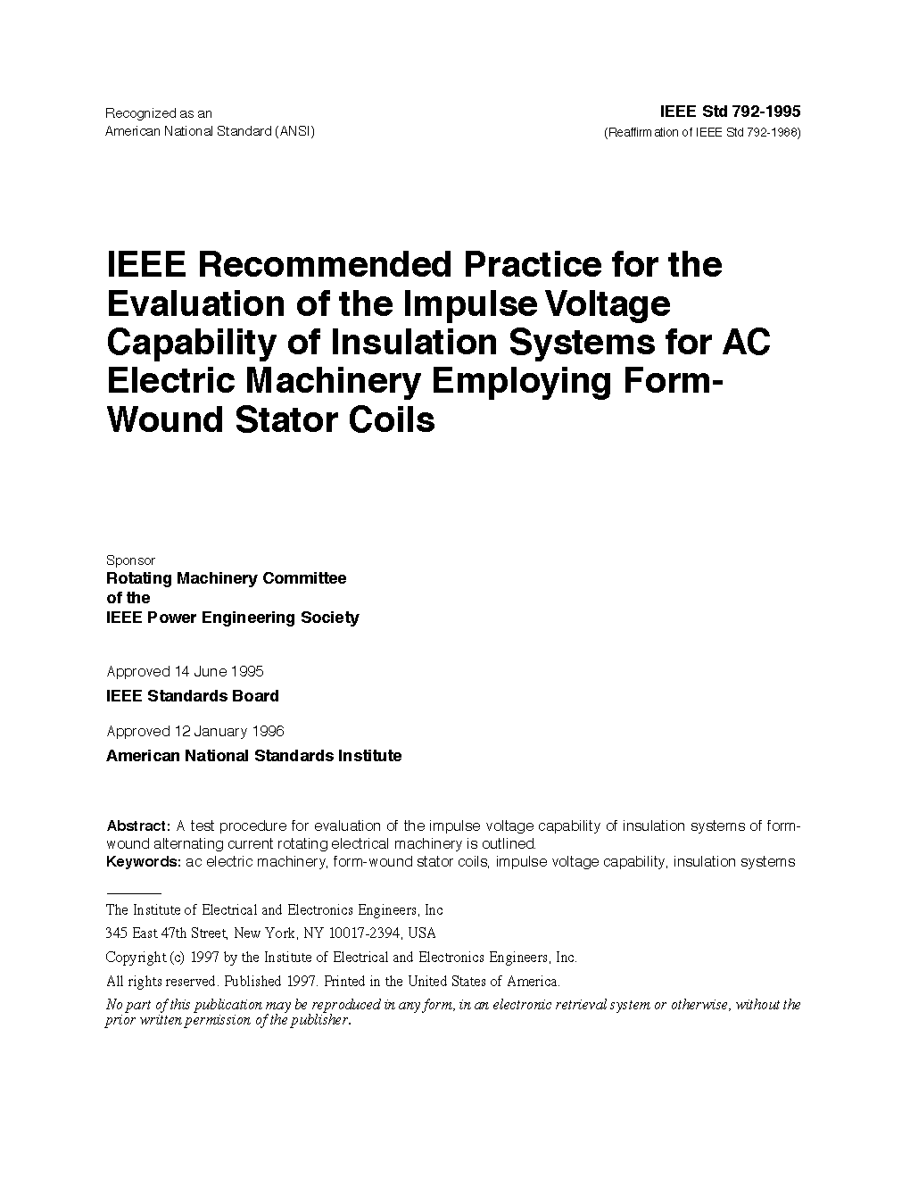This recommended practice outlines a test procedure for the evaluation of the impulse voltage capability of insulation systems of form-wound alternating current rotating electrical machinery.