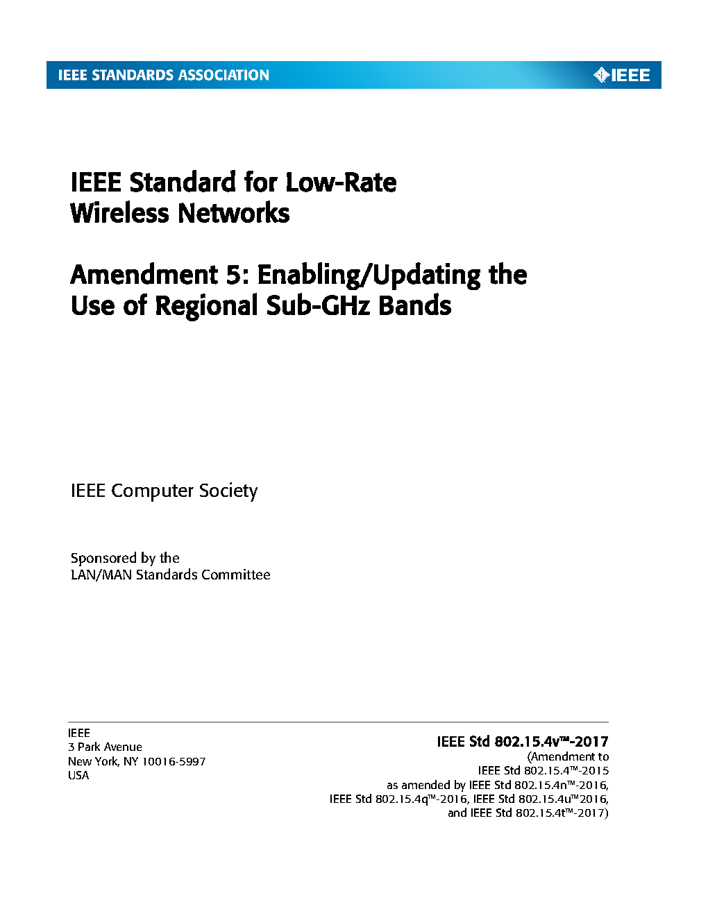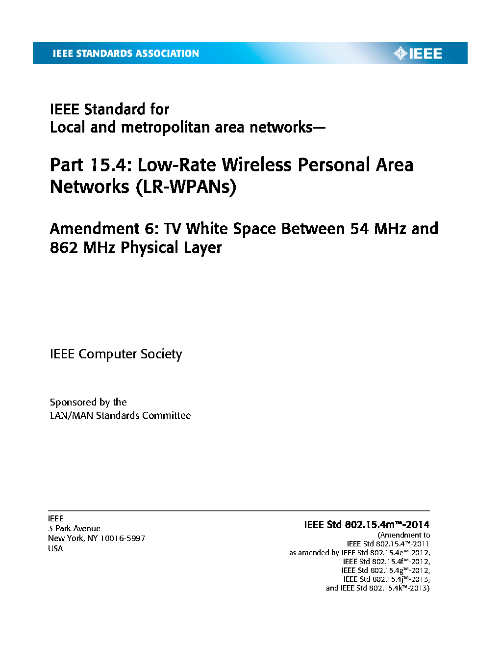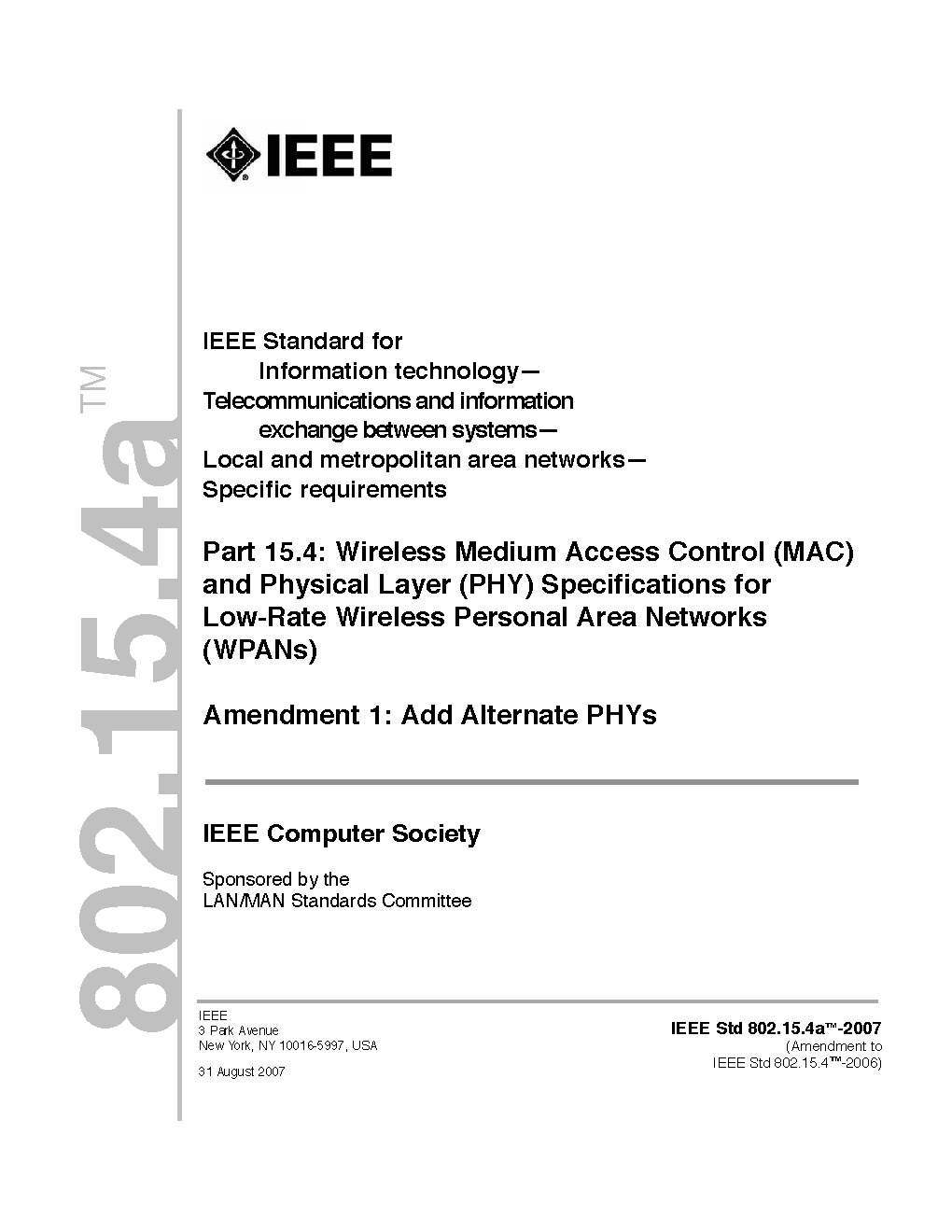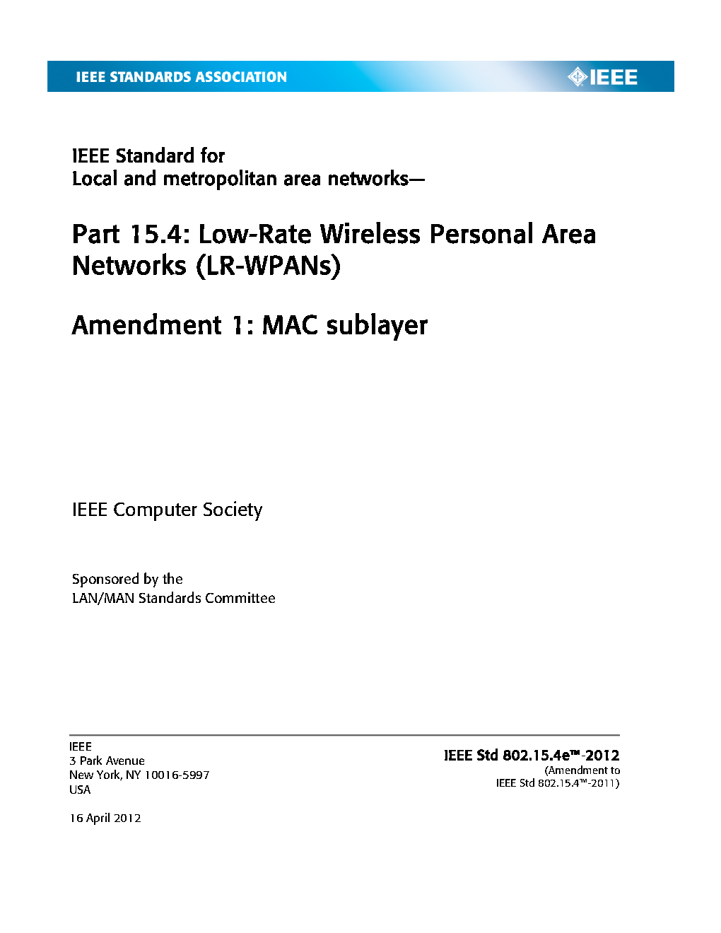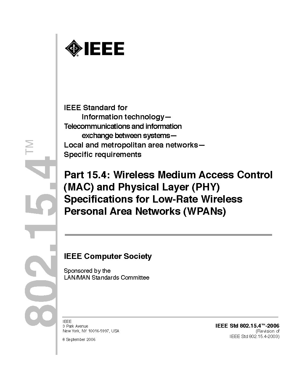 The physical layer (PHY) and medium access control (MAC) sublayer specifications for low-data-rate wireless connectivity with fixed, portable, and moving devices with no battery or very limited battery consumption requirements are defined in this standard. In addition, the standard provides modes that allow for precision ranging. PHYs are defined for devices operating in a variety of geographic regions. (The PDF of the standard is available at no cost at https://ieeexplore.ieee.org/browse/standards/get-program/page/series?id=68 compliments of the IEEE GET program)