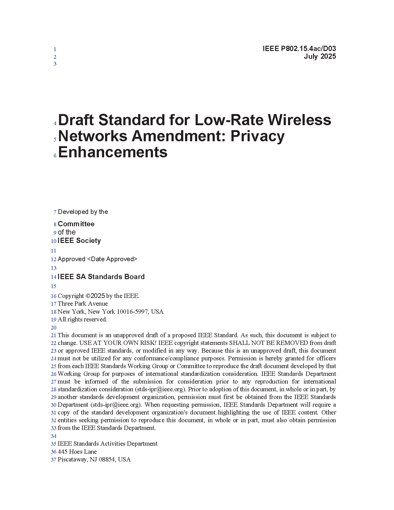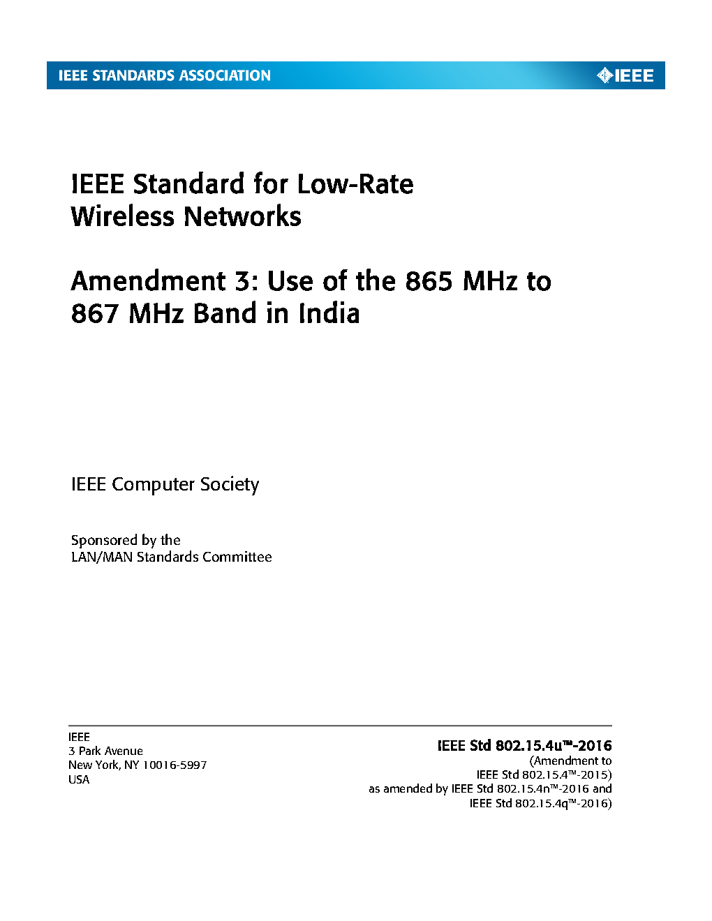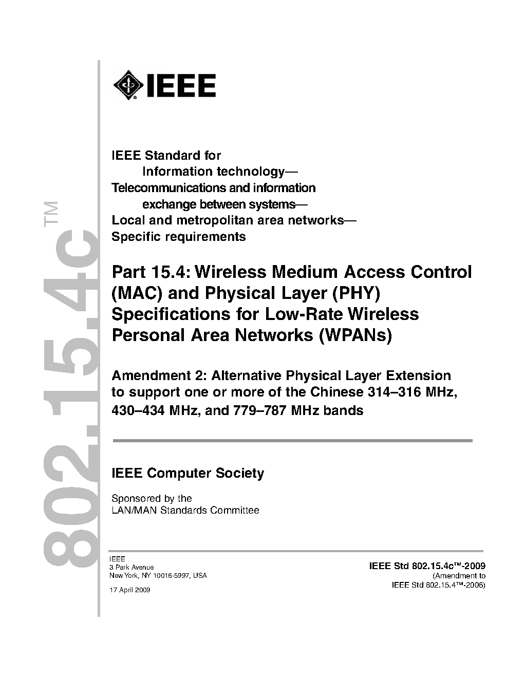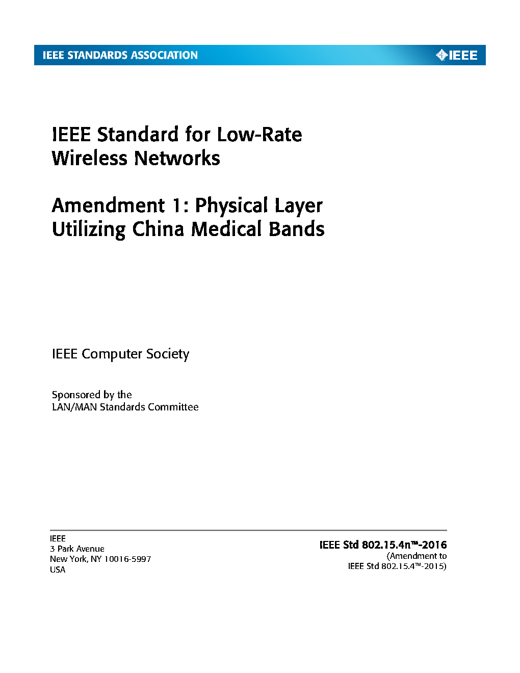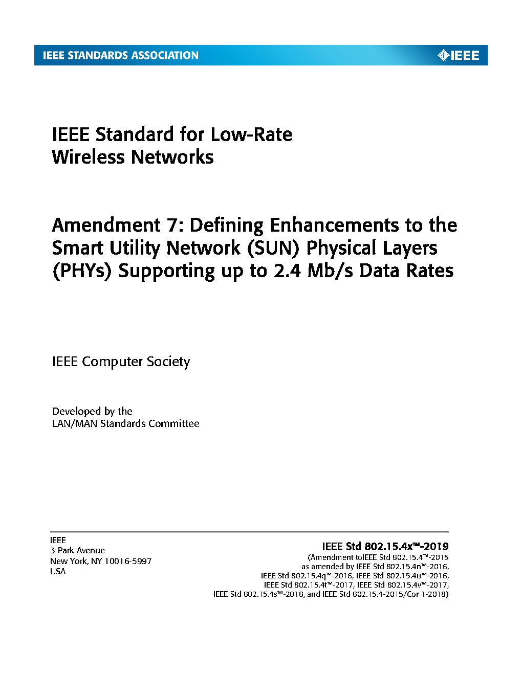 The physical layer (PHY) and medium access control (MAC) sublayer specifications for low-data-rate wireless connectivity with fixed, portable, and moving devices with no battery or very limited battery consumption requirements are defined in this standard. In addition, the standard provides modes that allow for precision ranging. PHYs are defined for devices operating in a variety of geographic regions. (The PDF of the standard is available at no cost at https://ieeexplore.ieee.org/browse/standards/get-program/page/series?id=68 compliments of the IEEE GET program)