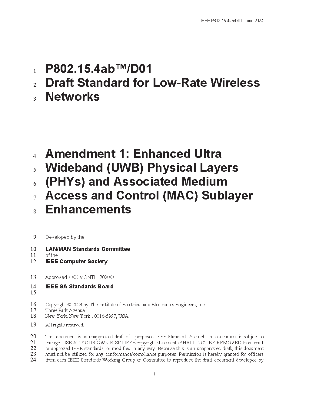 This standard defines the physical layer (PHY) and medium access control (MAC) sublayer specifications for low-data-rate wireless connectivity with fixed, portable, and moving devices with no battery or very limited battery consumption requirements. In addition, the standard provides modes that allow for precision ranging. PHYs are defined for devices operating in a variety of geographic regions.