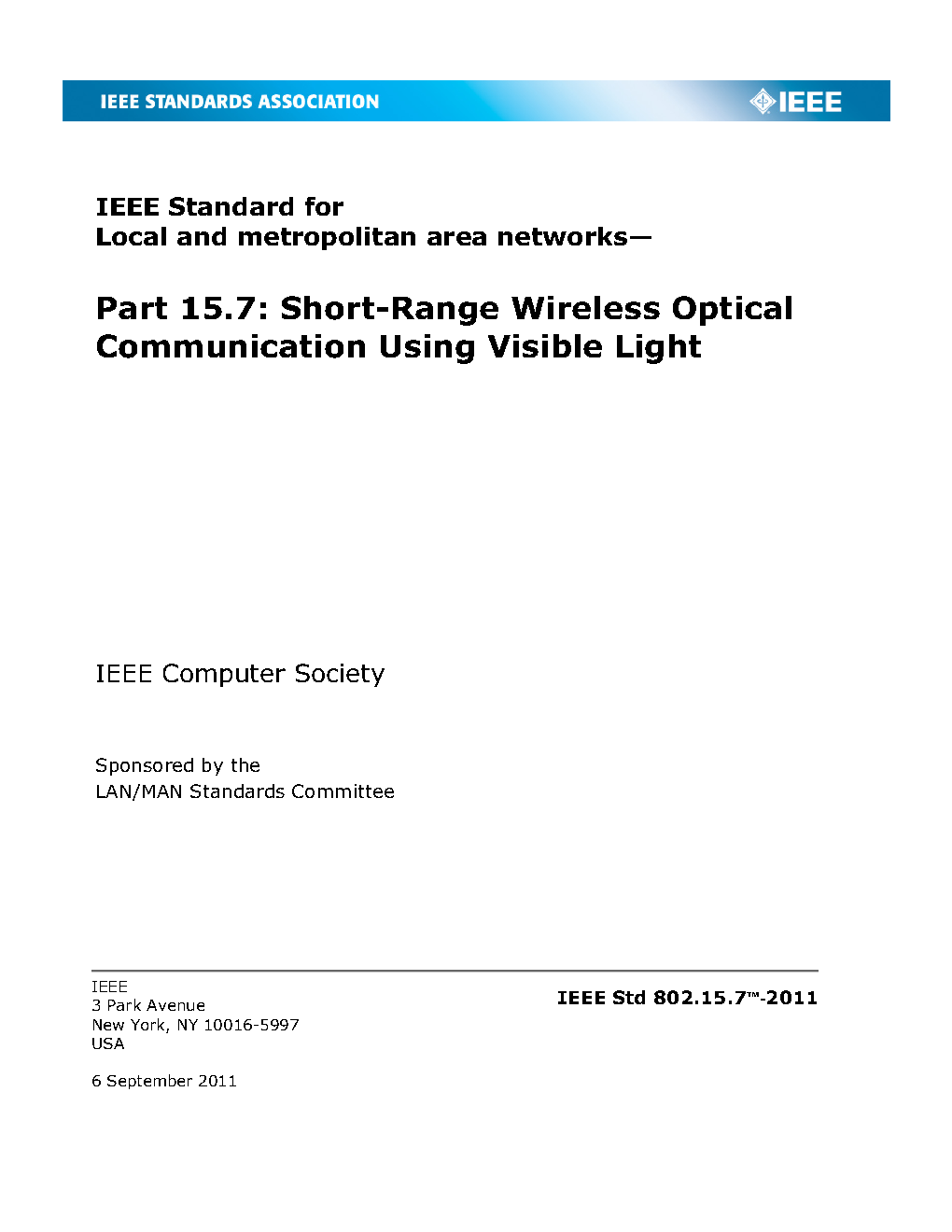 This standard provides a global standard for short-range optical wireless communication. The standard provides (i) access to several hundred THz of unlicensed spectrum; (ii) immunity to electromagnetic interference and noninterference with Radio Frequency (RF) systems; (iii) for visible light systems, additional security by allowing the user to see the communication channel; and (iv) communication augmenting and complementing existing services (such as illumination, display, indication, decoration, etc.).