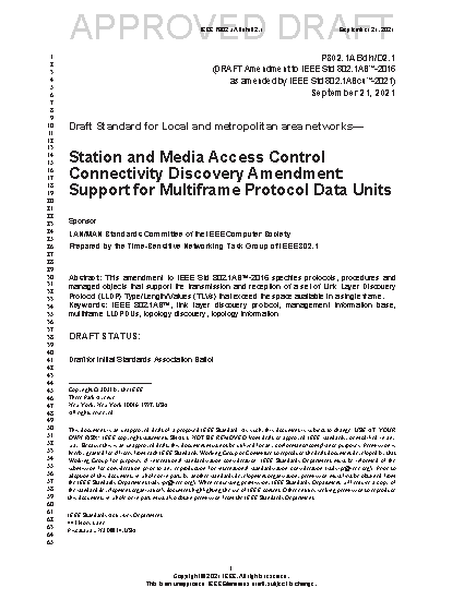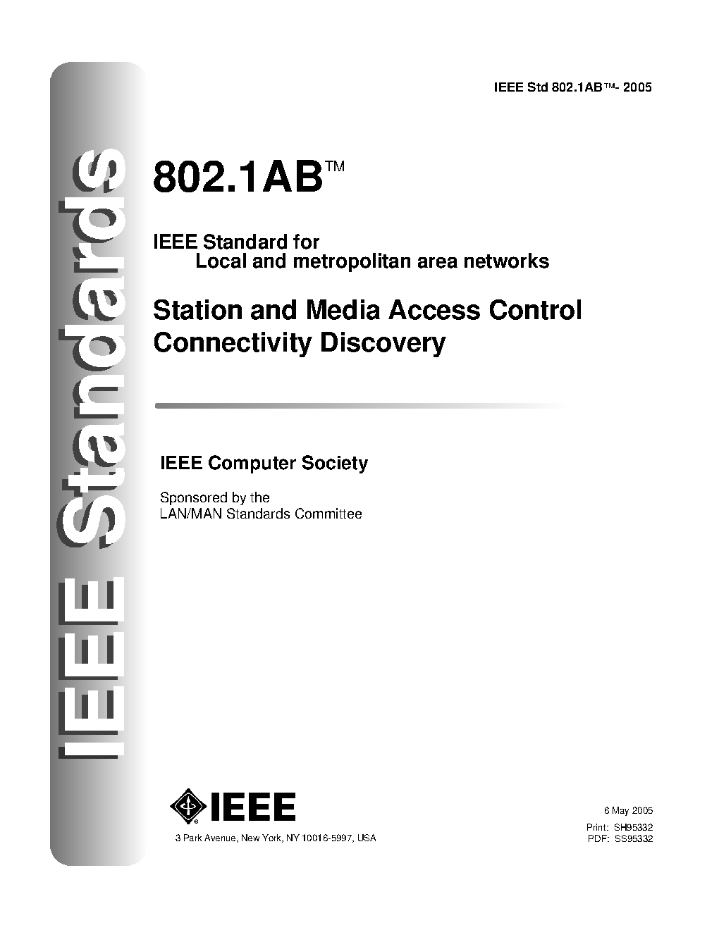 The scope of this standard is to define a protocol and management elements, suitable for advertising information to stations attached to the same IEEE 802 LAN, for the purpose of populating physical topology and device discovery management information databases. The protocol facilitates the identification ofstations connected by IEEE 802 LANs/MANs, their points of interconnection, and access points for management protocols.