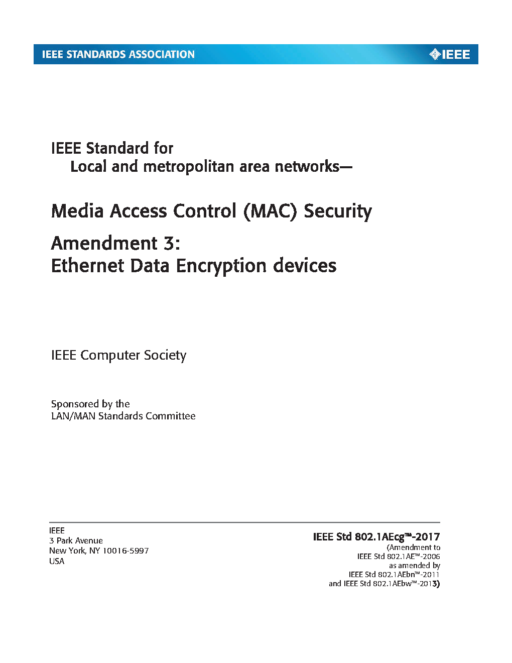 This standard specifies how all or part of a network can be secured transparently to peer protocol entities that use the MAC Service provided by IEEE 802® LANs to communicate. MAC security (MACsec) provides connectionless user data confidentiality, frame data integrity, and data origin authenticity.