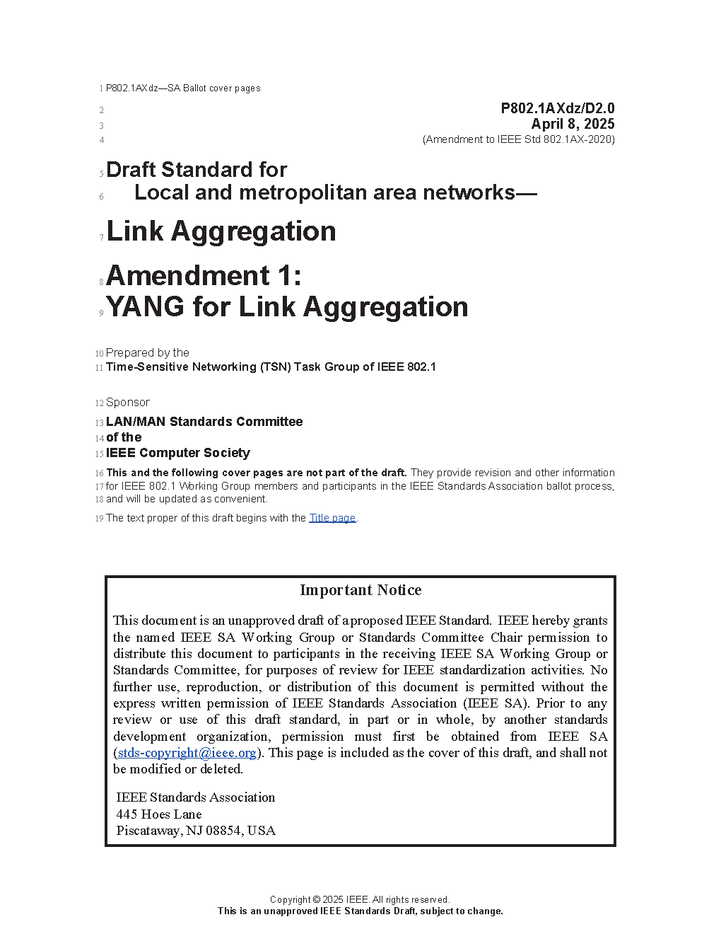 Link Aggregation allows one or more links to be aggregated together to form a Link Aggregation Group, such that a MAC Client can treat the Link Aggregation Group as if it were a single link. To this end, it specifies the establishment of data terminal equipment (DTE) to DTE logical links, consisting of N parallel instances of full duplex point-to-point links operating at the same data rate. This standard defines the MAC independent Link Aggregation capability, and general information relevant to specific MAC types that support Link Aggregation.