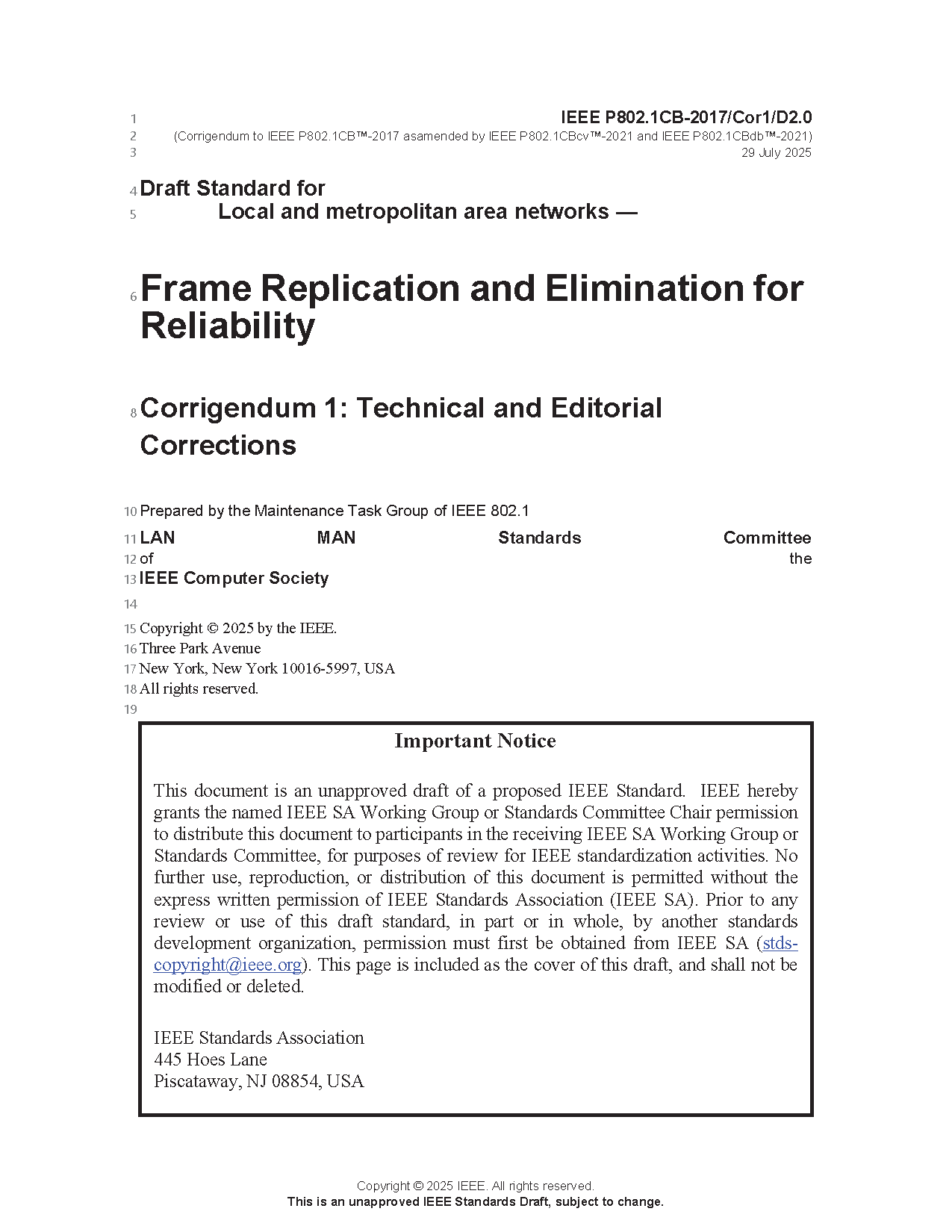 This standard specifies procedures, managed objects, and protocols for bridges and end systems that provide identification and replication of packets for redundant transmission, identification of duplicate packets, and elimination of duplicate packets. It is not concerned with the creation of the multiple paths over which the duplicates are transmitted. (The PDF of this standard is available at no cost at http://standards.ieee.org/findstds/standard/802.1CB-2017.html)