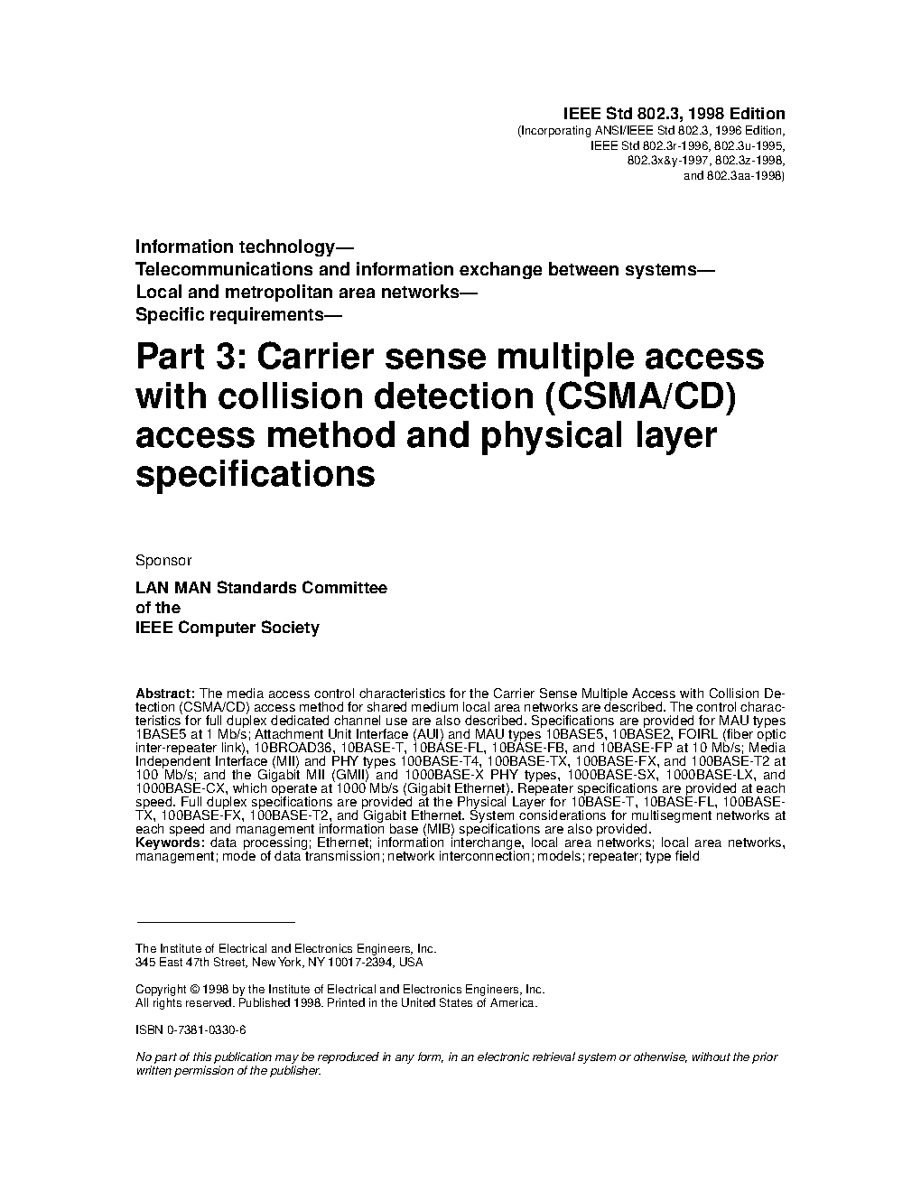 IEEE Standard for Information Technology - Telecommunications and Information Exchange Between Systems - Local and Metropolitan Area Networks - Specific Requirements Part 3: Carrier Sense Multiple Access with Collision Detection (CSMA/CD) Access Method and Physical Layer Specifications - Corrigendum 1