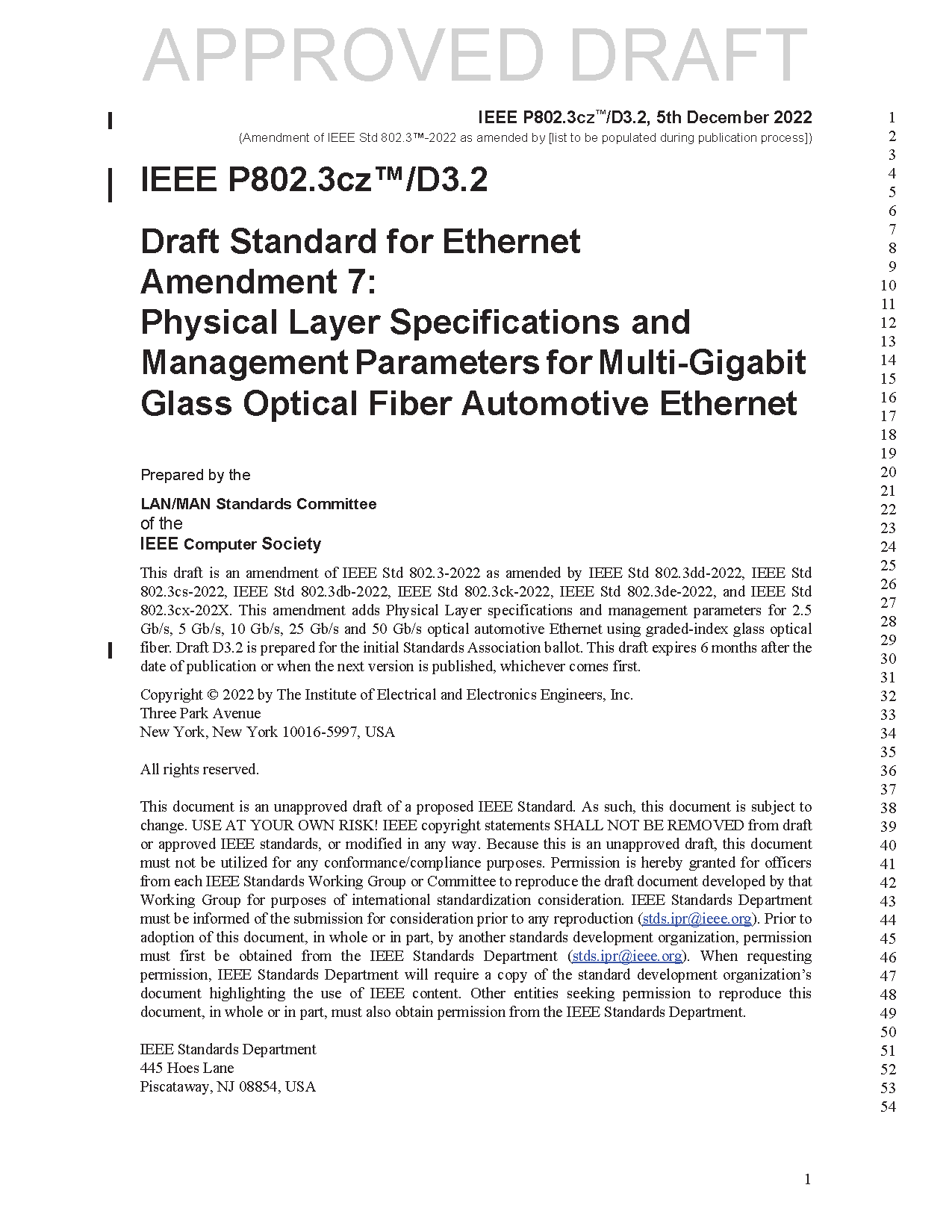 This corrigendum to IEEE Std 802.3-2022 corrects the MDI Return Loss specification for MultiGigabit Automotive Physical Layer entities (PHY) in Clause 149 and Clause 165.