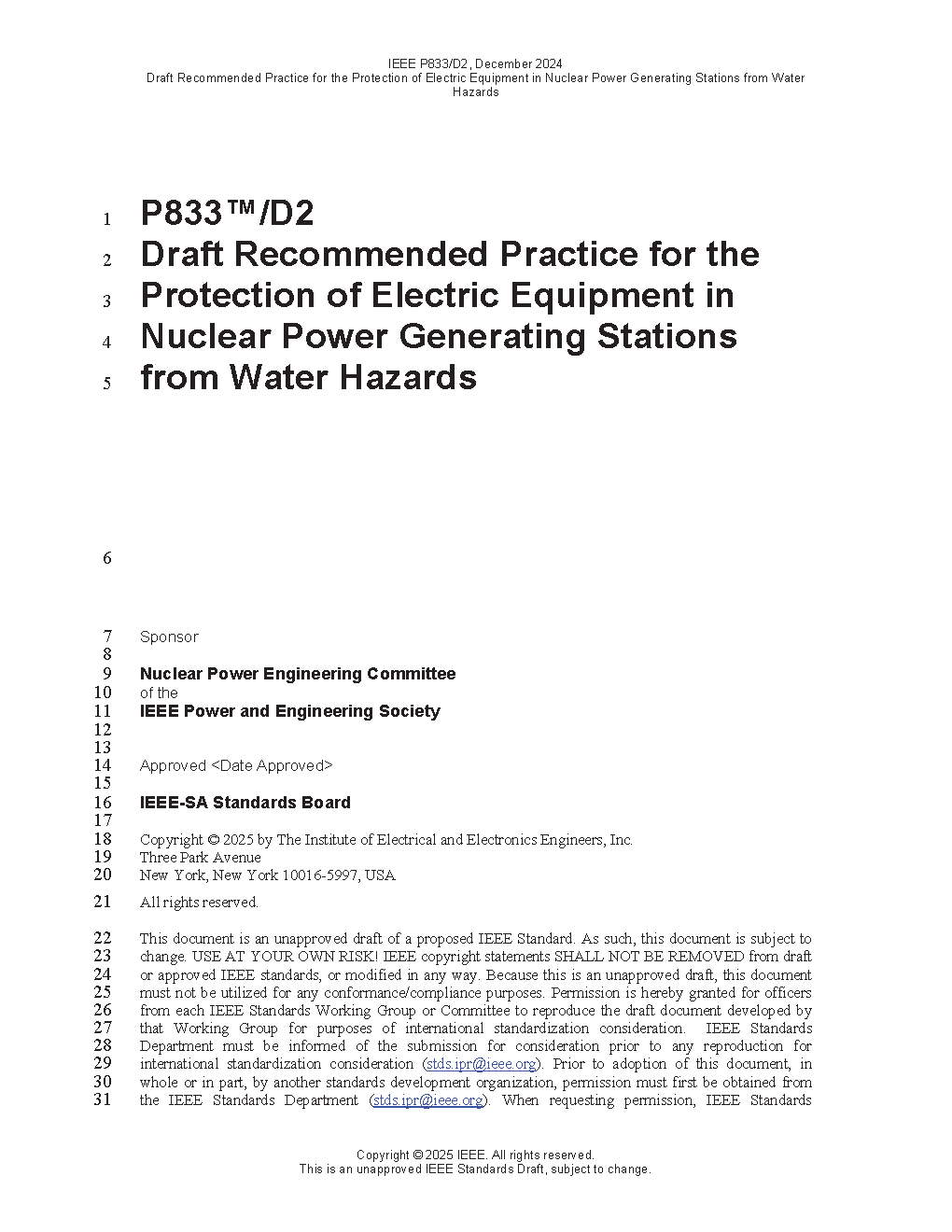 IEEE Recommended Practice for the Protection of Electric Equipment in Nuclear Power Generating Stations from Water Hazards