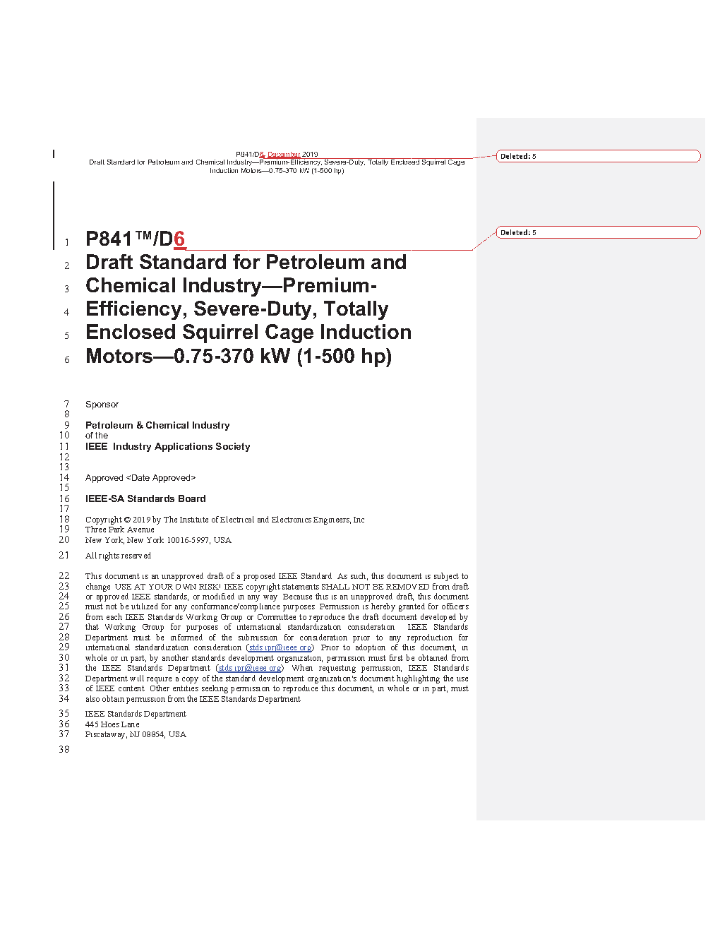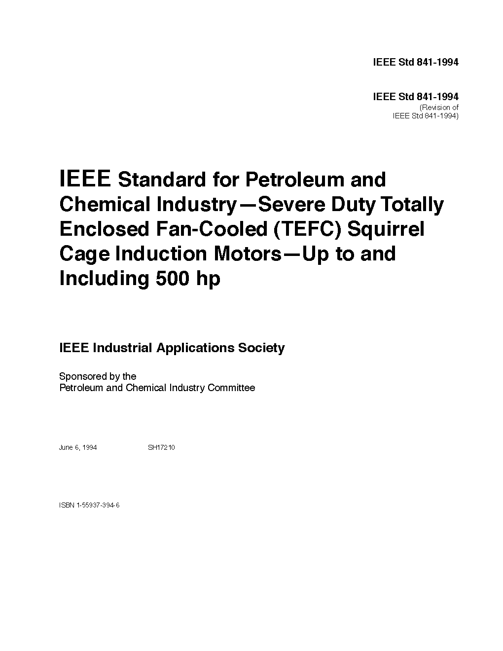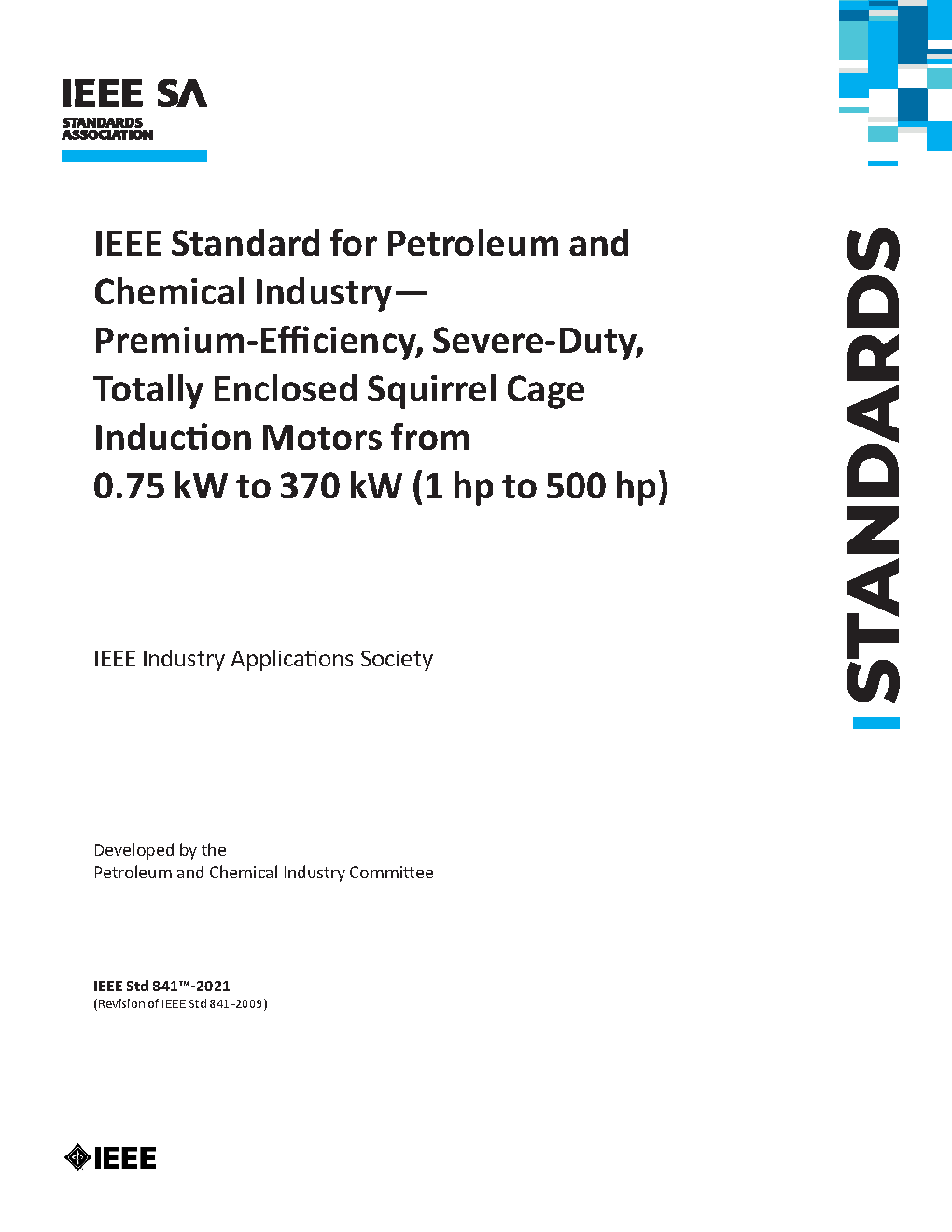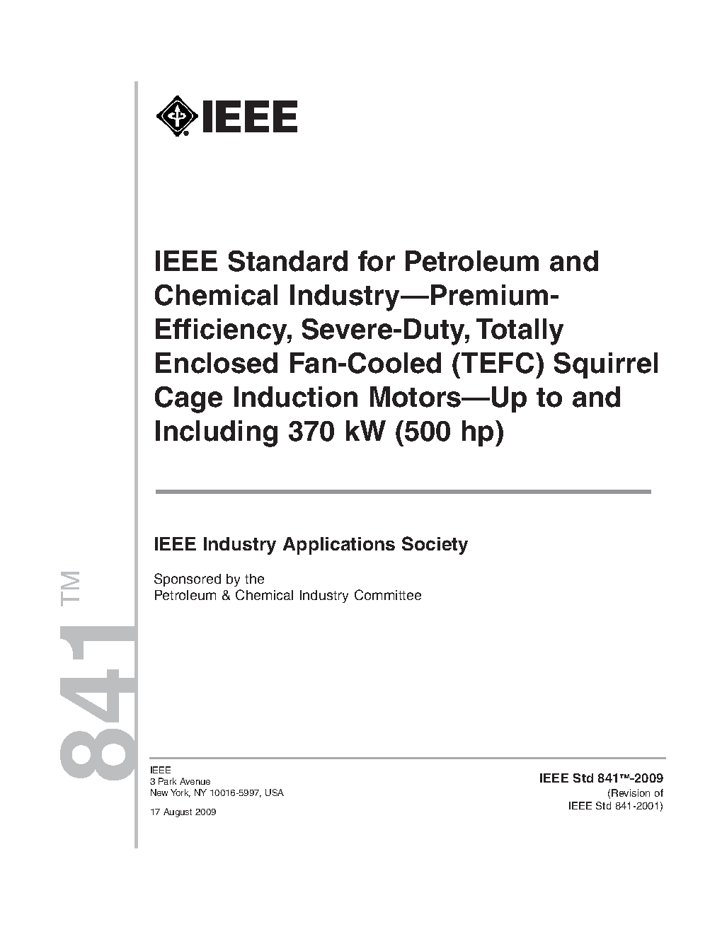 This standard applies to premium-efficiency totally enclosed fan-cooled (TEFC), horizontal and vertical, single-speed, squirrel cage polyphase induction motors, up to and including 370 kW (500 hp), and 4000 V nominal, in National Electrical Manufacturers Association (NEMA) frame sizes 143T and larger, for petroleum, chemical, and other severe-duty applications (commonly referred to as premium-efficiency severe-duty motors). Excluded from the scope of this standard are motors with sleeve bearings and additional specific features required for explosion-proof motors.