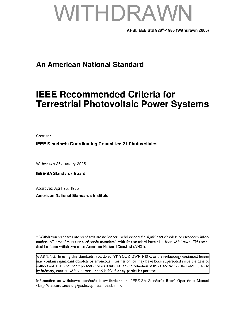 Jan 2005: Administratively withdrawn. General performance criteria for terrestrial photovoltaic (PV) systems are established, and an overall framework for all detailed terrestrial photovoltaic power system performance standards is provided. Criteria for subsystem performance and standard test methods to be used for performance measurements are recommended. System installation, operation, and maintenance are covered. Since thermal conditioning elements may be part of the system design, some consideration is given to the thermal subsystem. The criteria apply to all terrestrial photovoltaic power systems.