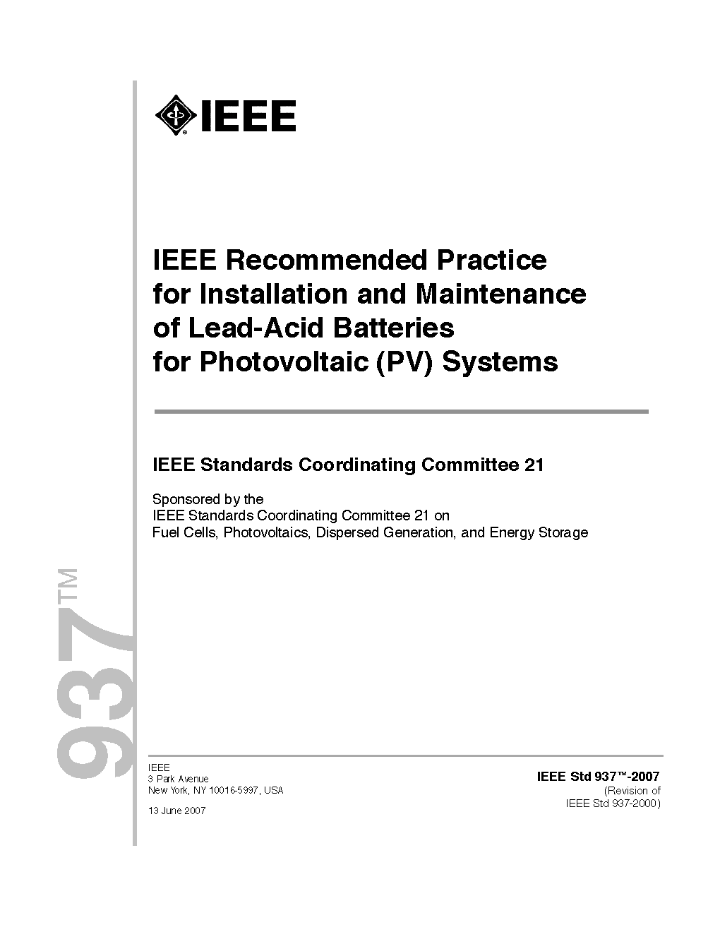 This recommended practice is meant to assist lead-acid battery users to properly store, install, and maintain lead-acid batteries used in residential, commercial, and industrial photovoltaic systems.