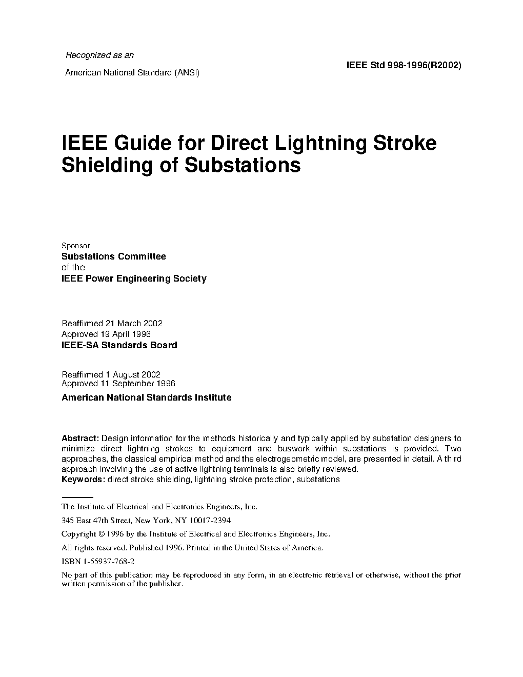This guide identifies and discusses design procedures to provide direct stroke shielding of outdoor distribution, transmission, and generating plant substations. Known methods of shielding from direct strokes were investigated during the preparation of this guide, and information is provided on two methods found to be widely used: a) The classical empirical method b) The electrogeometric model A third approach, which involves the use of non-conventional lightning terminals and related design methods, is also reviewed. This guide does not purport to include all shielding methods that may have been developed. The guide also does not address protection from surges entering a substation over power or communication lines or the personnel safety issues. Users of this guide should thoroughly acquaint themselves with all factors that relate to the design of a particular installation and use good engineering judgment in the application of the methods given here, particularly with respect to the importance and value of the equipment being protected.