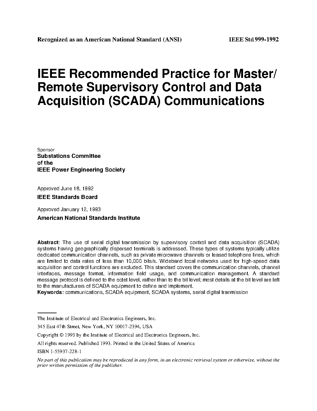 IEEE Recommended Practice for Master/Remote Supervisory Control and Data Acquisition (SCADA) Communications