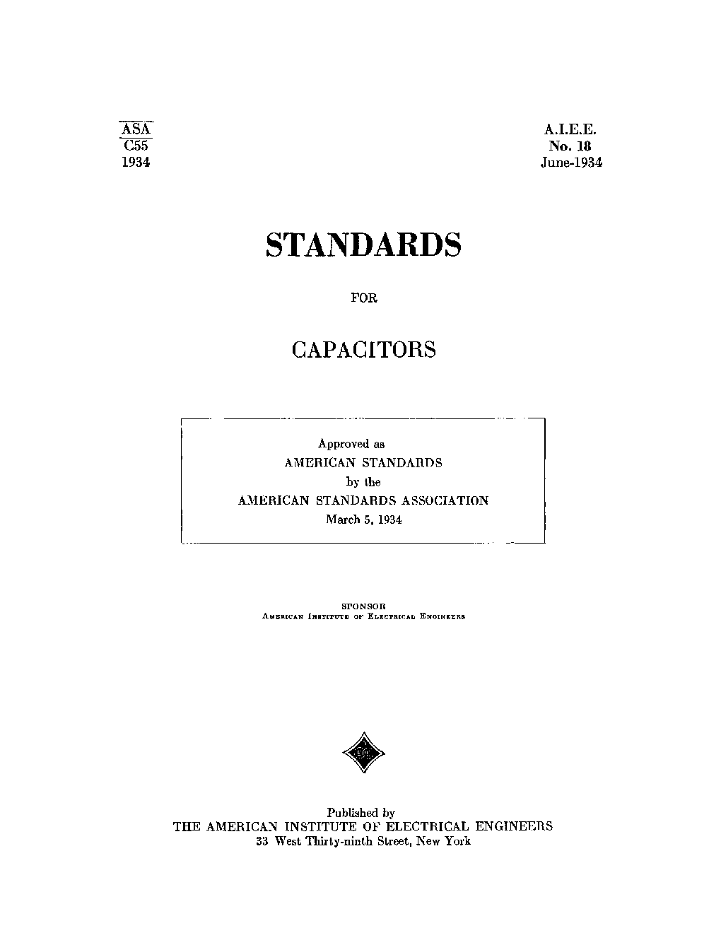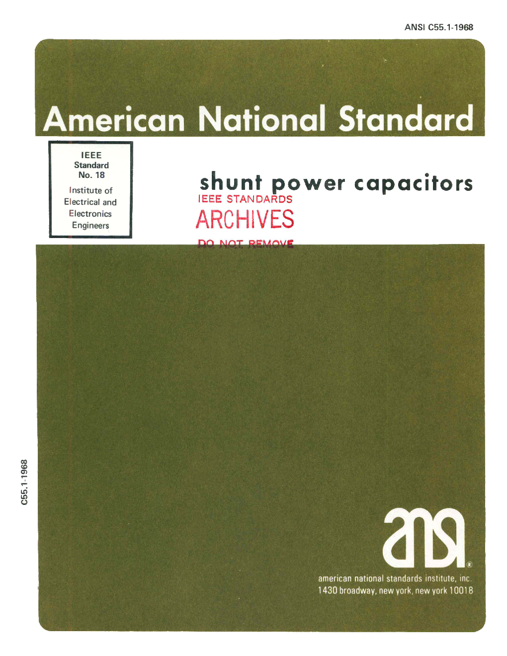 Capacitors rated 216 V or higher, 2.5 kvar or more, and designed for shunt connection to alternating-current transmission and distribution systems operating at a nominal frequency of 50 or 60 Hz are considered. Service conditions, ratings, manufacturing, and testing are covered. A guide to the application and operation of power capacitors is included.