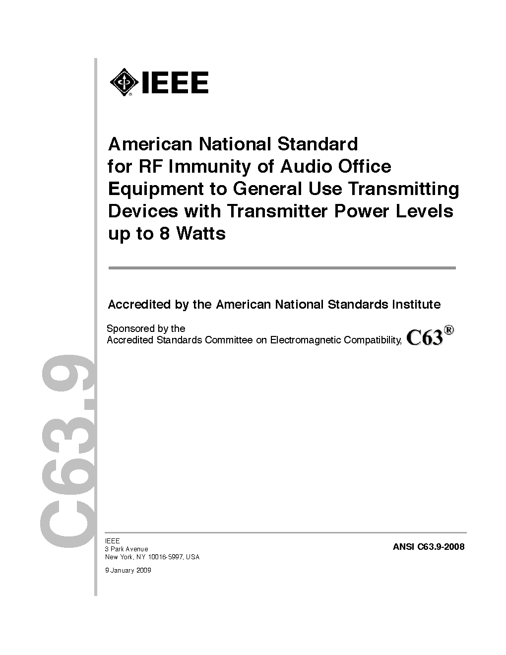 This standard provides test methods and limits for evaluation of the RF immunity of audio office equipment, e.g., microphones, telecommunication end point equipment, speakerphones, public address systems, and their associated equipment. The purpose of the document is to provide the required tests and parameters so that office equipment will operate properly in the RF environments commonly found in the vicinity of portable transmitters or stationary emitters, e.g., wireless routers.