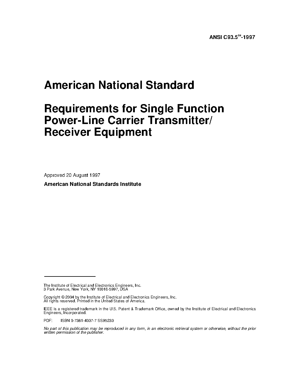 American National Standard Requirements for Single Function Power-Line Carrier Transmitter/Receiver Equipment