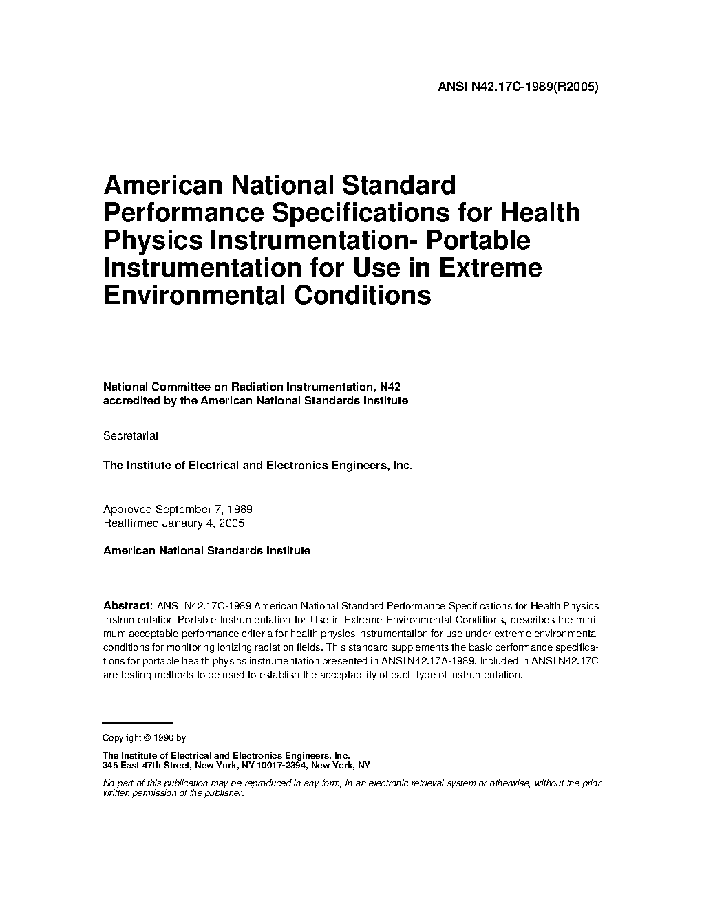 ANSI N42.17C-1989 American National Standard Performance Specifications for Health Physics InstrumentationPortable Instrumentation for Use in Extreme Environmental Conditions, describes the minimum acceptable performance criteria for health physics instrumentation for use under extreme environmental conditions for monitoring ionizing radiation fields. This standard supplements the basic performance specifications for portable health physics instrumentation presented in ANSI N42.17A-1989.
