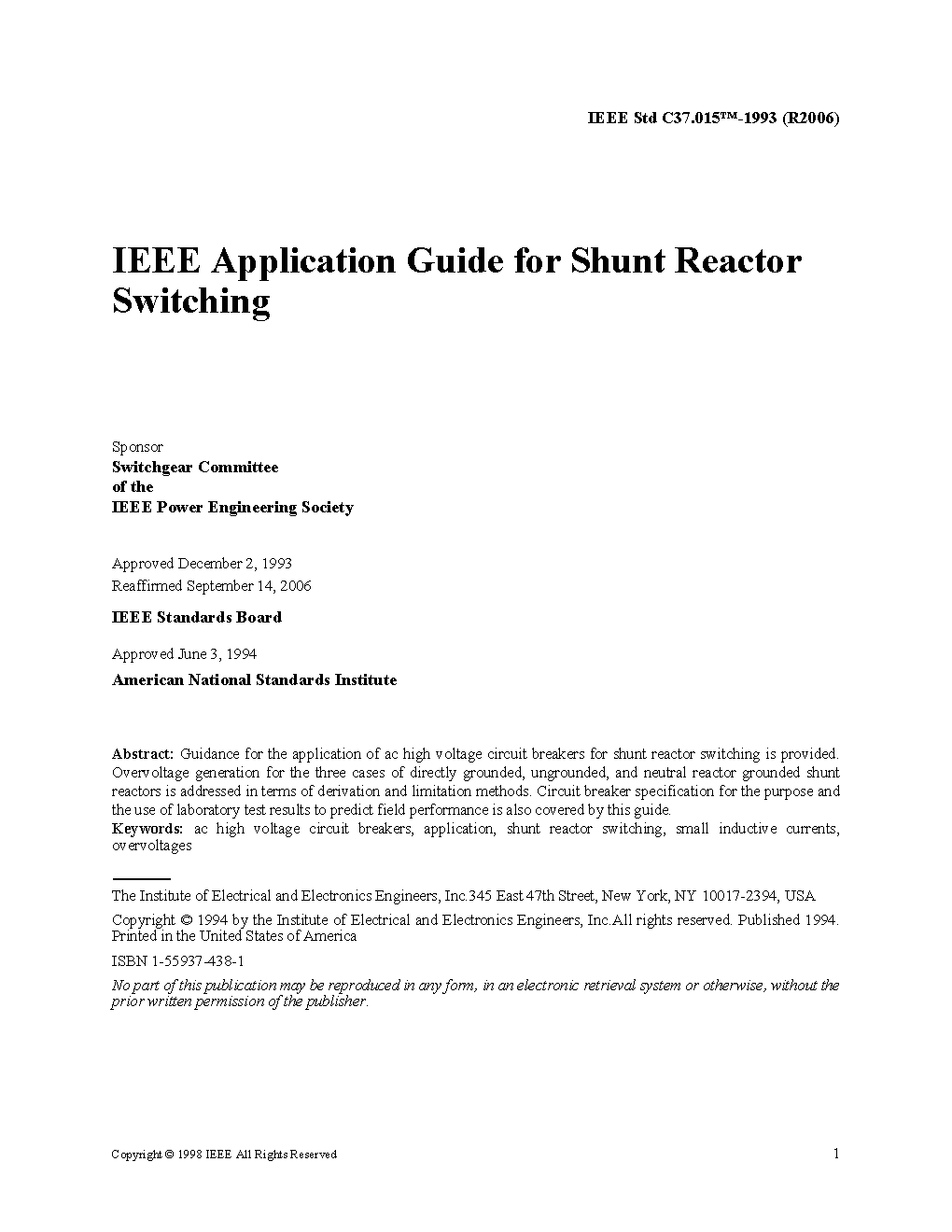 Guidance for the application of ac high-voltage circuit breakers for shunt reactor switching is provided. Overvoltage generation for the three cases of shunt reactors being directly grounded, ungrounded, or grounded through a neutral reactor is addressed in terms of derivation and limitation methods. Circuit breaker specification for the purpose and the use of laboratory test results to predict field performance is also covered by this guide.