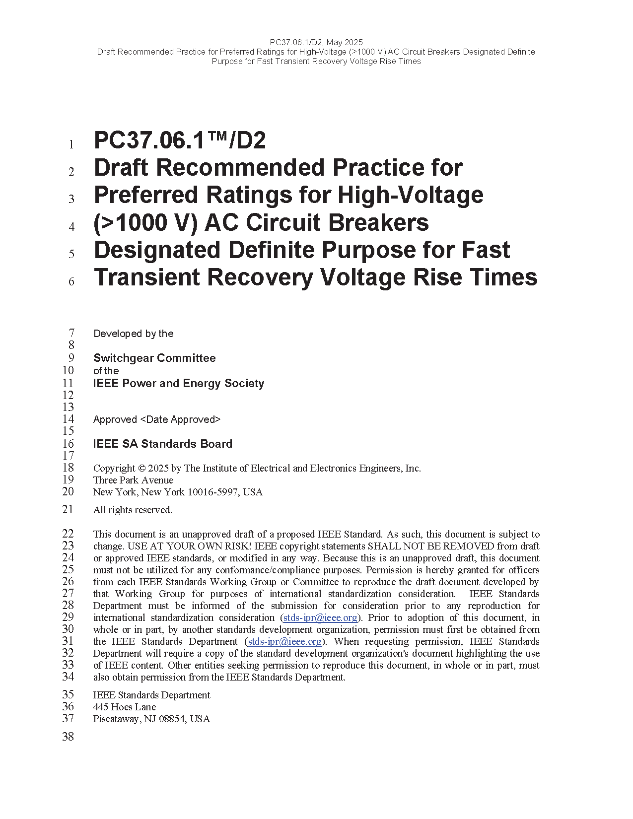 The purpose of this document is to introduce transformer-limited faults, similar to that established by IEEE Std C37.016 [B5], and specifically to provide preferred values for standard ratings of fast transient referred to as transformer-limited fault recovery voltage rise times and to introduce a transformer-limited fault (TLF) breaking current.