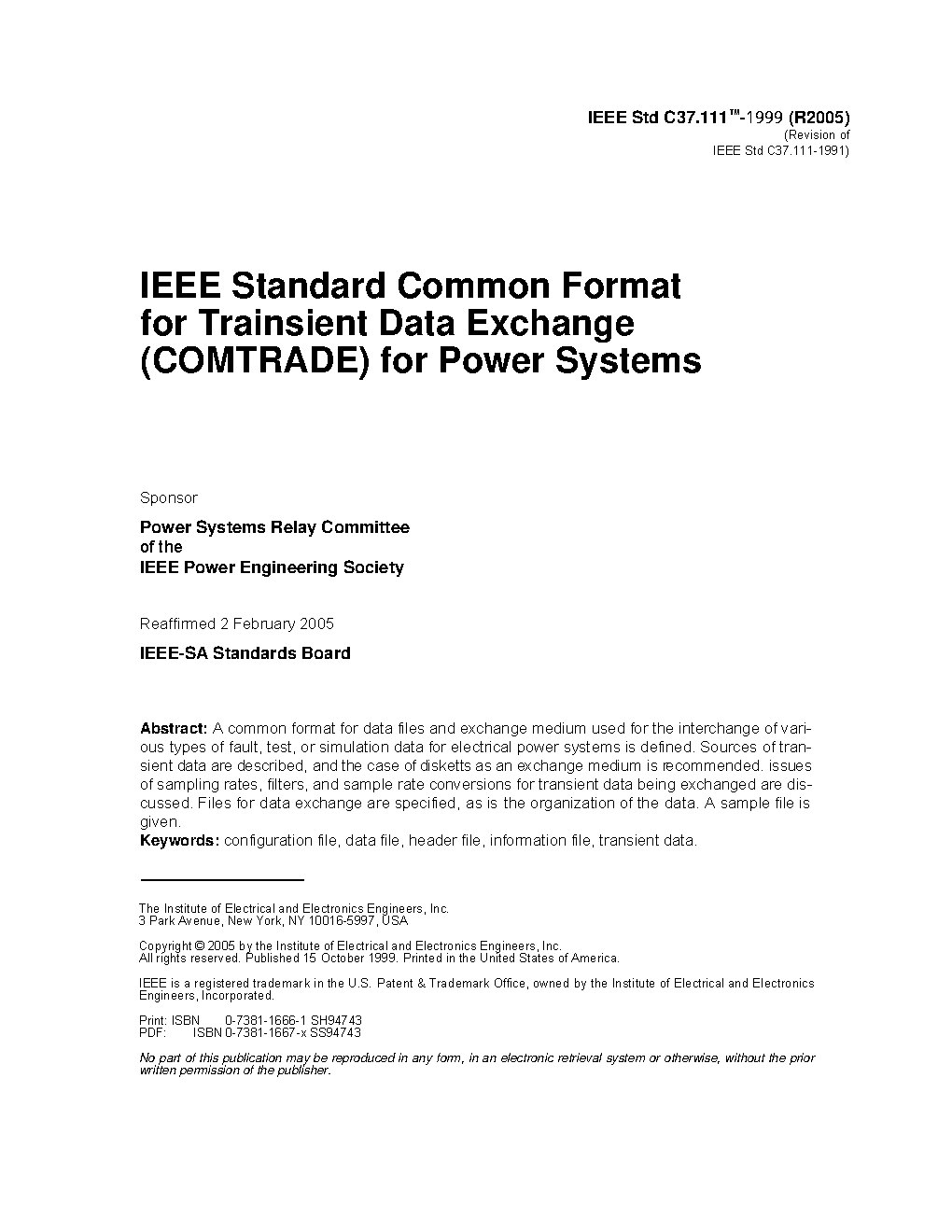 The rapid evolution and implementation of digital devices for fault and transient data recording and testing in the electric utility industry has generated the need for a standard format for the exchange of such data for use with various devices to enhance and automate the analysis, testing, evaluation, and simulation of the power system and related protection schemes during fault and disturbance conditions.