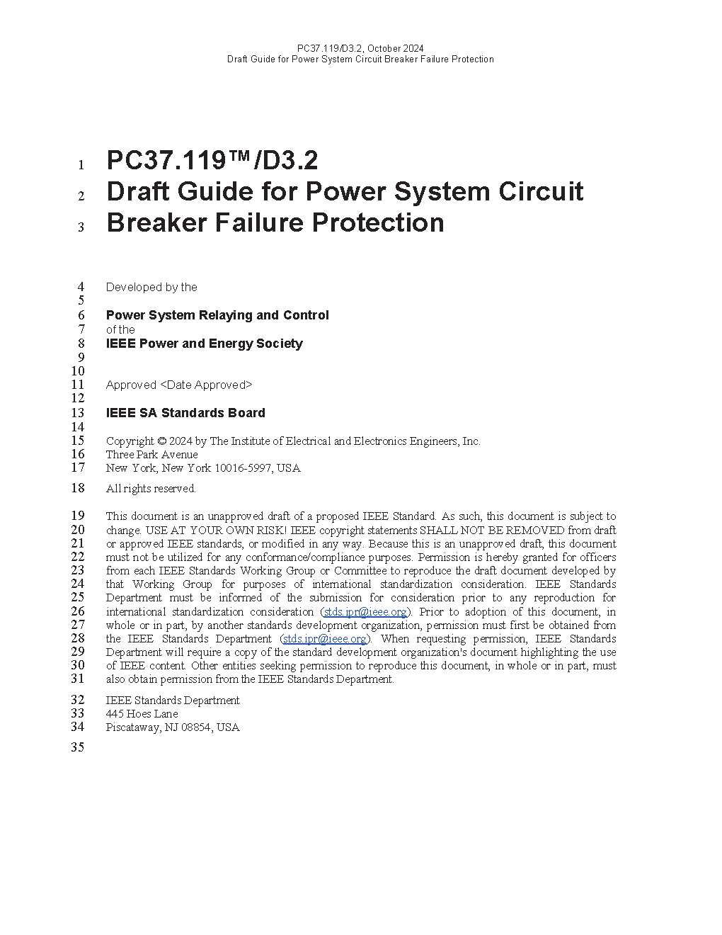 This guide describes methods to protect a power system from faults that are not cleared because of failure of a power circuit breaker to operate or interrupt when called upon by a protective relay. The intent is to give the reader a guide in how to detect that a breaker has failed to clear a fault, and how to electrically isolate the fault after the breaker has failed to clear the fault. Additionally, schemes that provide primary protection of the power system from performance failures of the power circuit breaker other than fault clearing failures such as failure to operate, either tripping or closing, manual or automatic, are also described. Such schemes, when applied, are typically integrated as a part of the overall BFP scheme. Also covered are recent practices that take advantage of new technologies.
