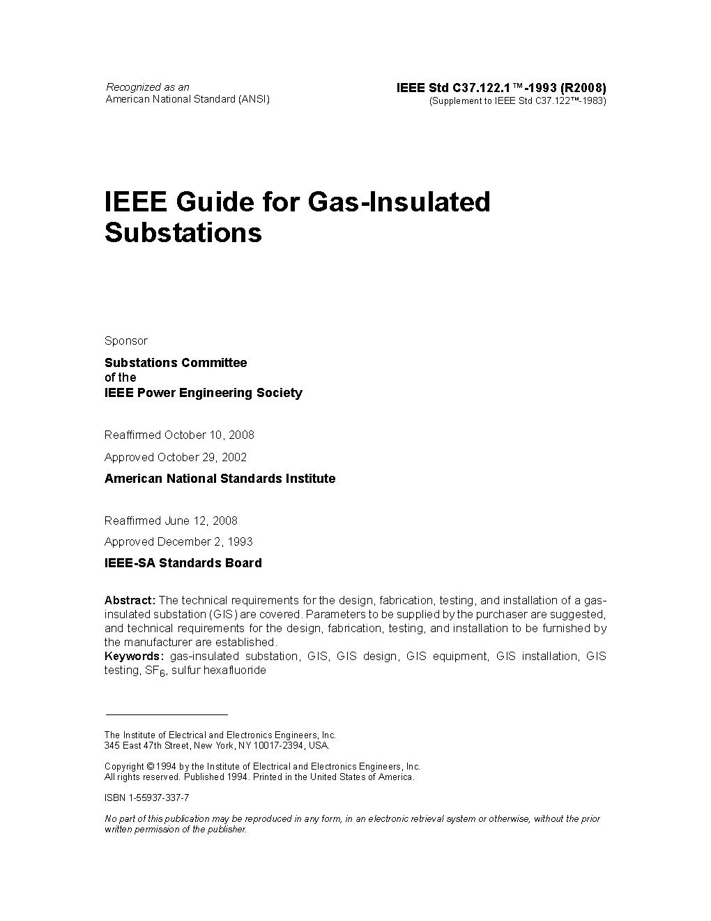 The purpose of this standard is to provide guidance on the most important requirements of high voltage gas-insulated substations above 52 kV, for users, manufacturers and engineering firms. Where feasible, this document will align with the international norms and standards and recognize international practices used outside North America. It will therefore provide a comprehensive guide with widespread application.