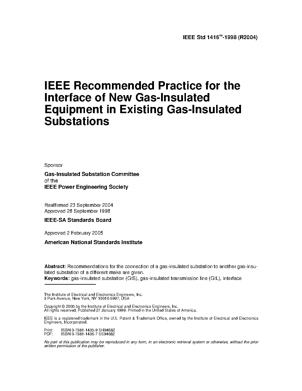 This document gives the recommended practices for designing and installing the interfaces between existing gas-insulated substation (GIS) equipment and new GIS equipment that is added at a later date and may be of different design and of different manufacturer. The recommended practices apply for GIS rated above 52 kV. They also include the interfaces between gas-insulated line (GIL) equipment and GIS equipment rated above 52 kV.