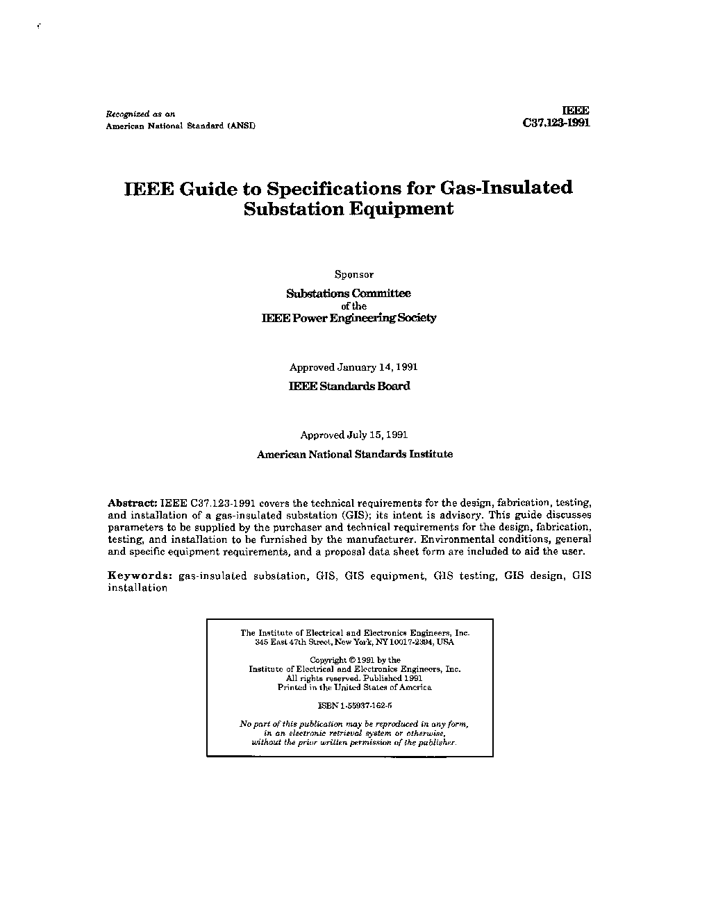 This guide is for the development of specifications for the technical requirements for the design, fabrication, testing, installation, and in-service performance of a high-voltage gas-insulated substation (GIS).