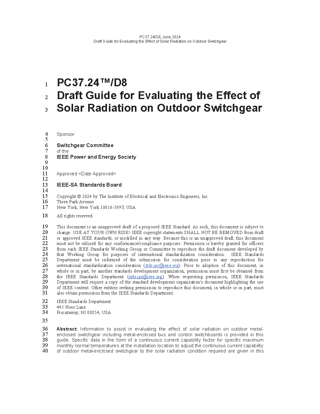 The general information in this Guide is intended to assist in evaluating the effect of solar radiation on outdoor metal-enclosed switchgear and is applicable to outdoor metal-enclosed power switchgear, control switchboards and metal-enclosed bus. Specific data are given in current temperature relationship and tabulation form for outdoor metal-enclosed low-voltage power circuit breaker switchgear, outdoor metal-clad switchgear and outdoor metal-enclosed interrupter switchgear.