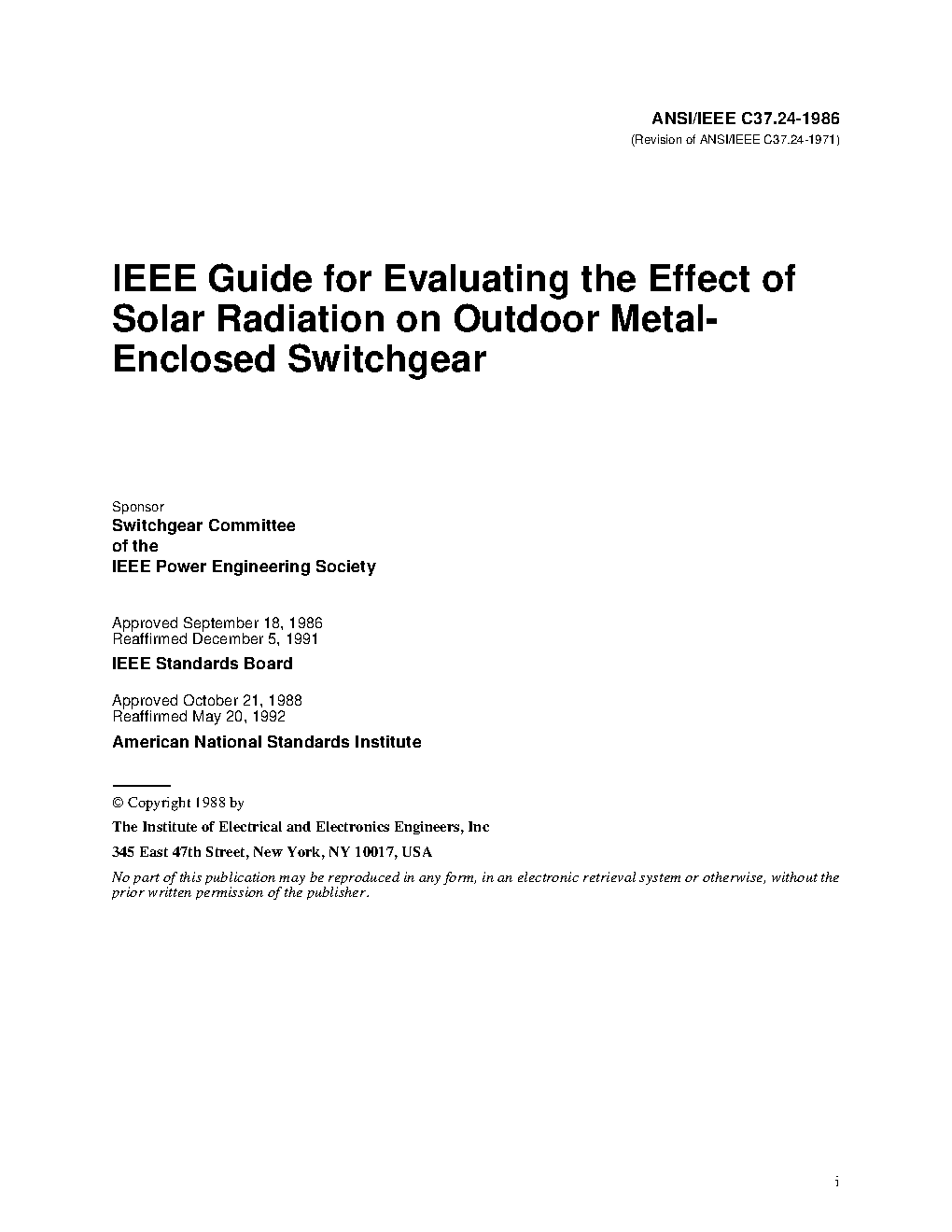This guide provides information to assist in evaluating the effect of solar radiation on outdoor metal-enclosed switchgear including metal-enclosed bus and control switchboards. Specific data are given in the form of a continuous current capability factor for specific maximum monthly normal temperatures at the installation location, to adjust the continuous current capability of outdoor metal-enclosed switchgear to the solar radiation condition required. Tables of maximum monthly normal temperatures at various locations in the US and Canada are provided.