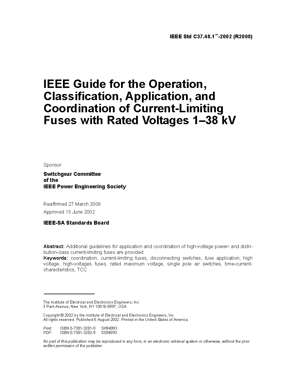 IEEE Guide for the Operation, Classification, Application, and Coordination of Current-Limiting Fuses with Rated Voltages 1-38kV