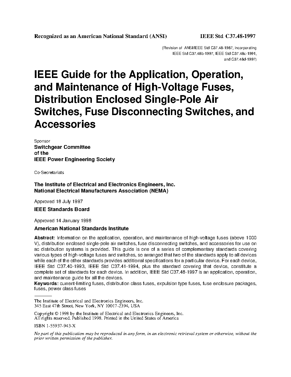 Information for understanding the construction, operation, and application of high-voltage (> 1000 V) fuses and accessories, intended for use on alternating current (ac) electrical distribution systems is provided. Current-limiting, expulsion, electronic, and other non-current-limiting fuses and accessories are covered, as are North American, European, and other application practices.